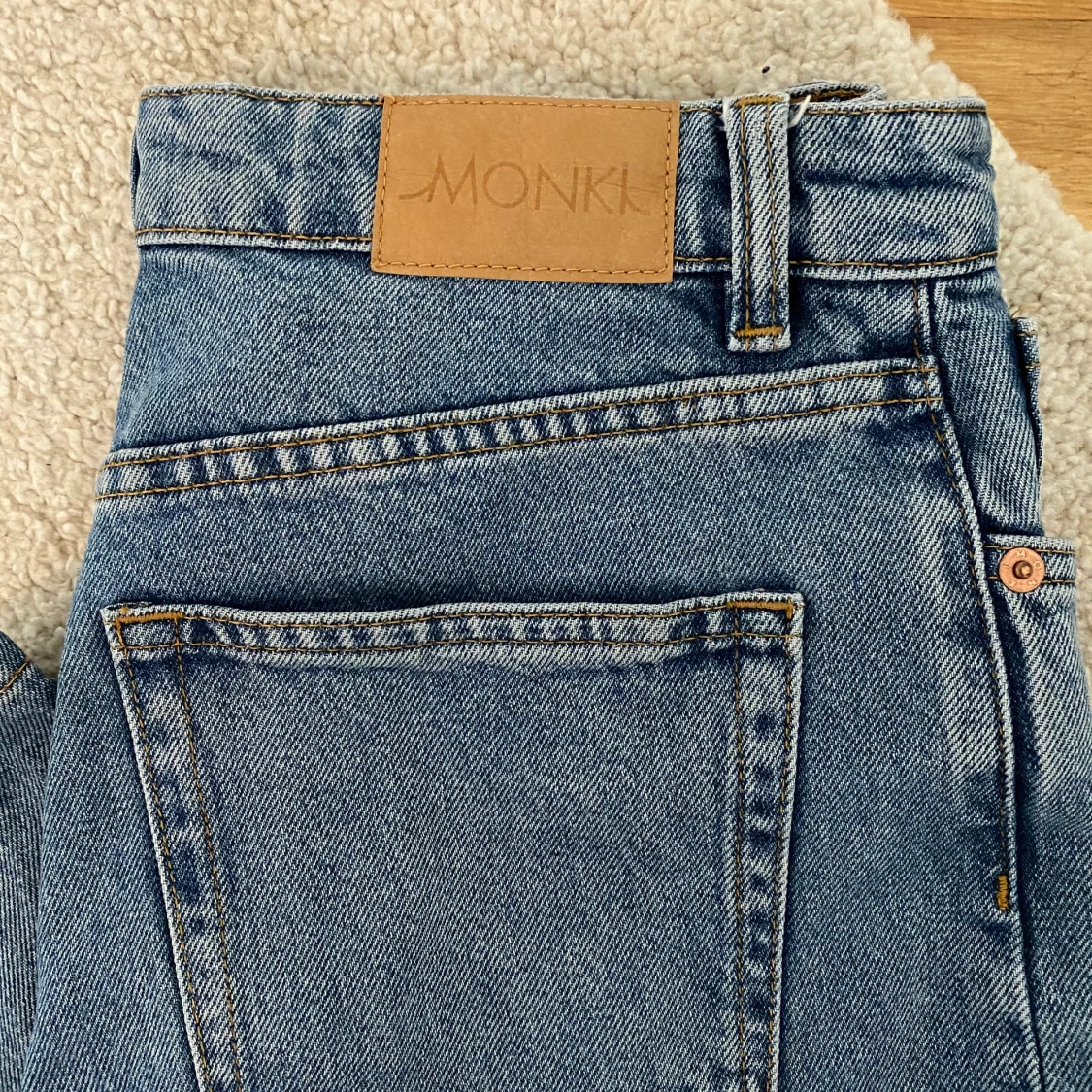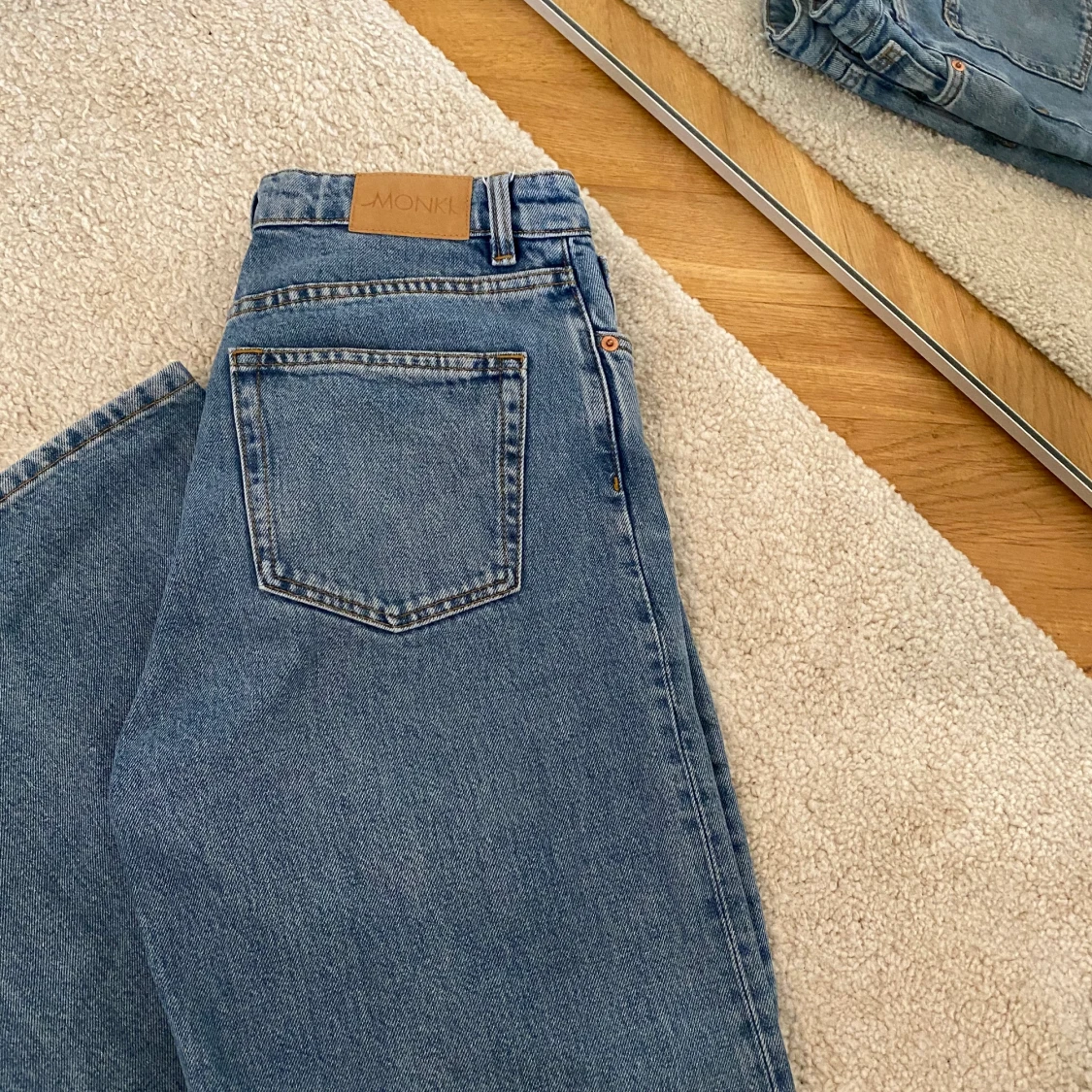 Supersnygga och trendiga jeans från Monki i färgen mod blue, väldigt snygg passform och bra längd (är 171 och jeansen slutar nedanför anklarna) endast använda två gånger💙🦋 150 kr vid snabb affär!! (Köparen står för frakten)