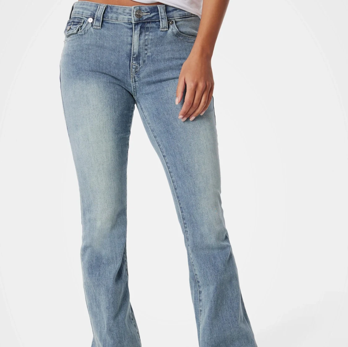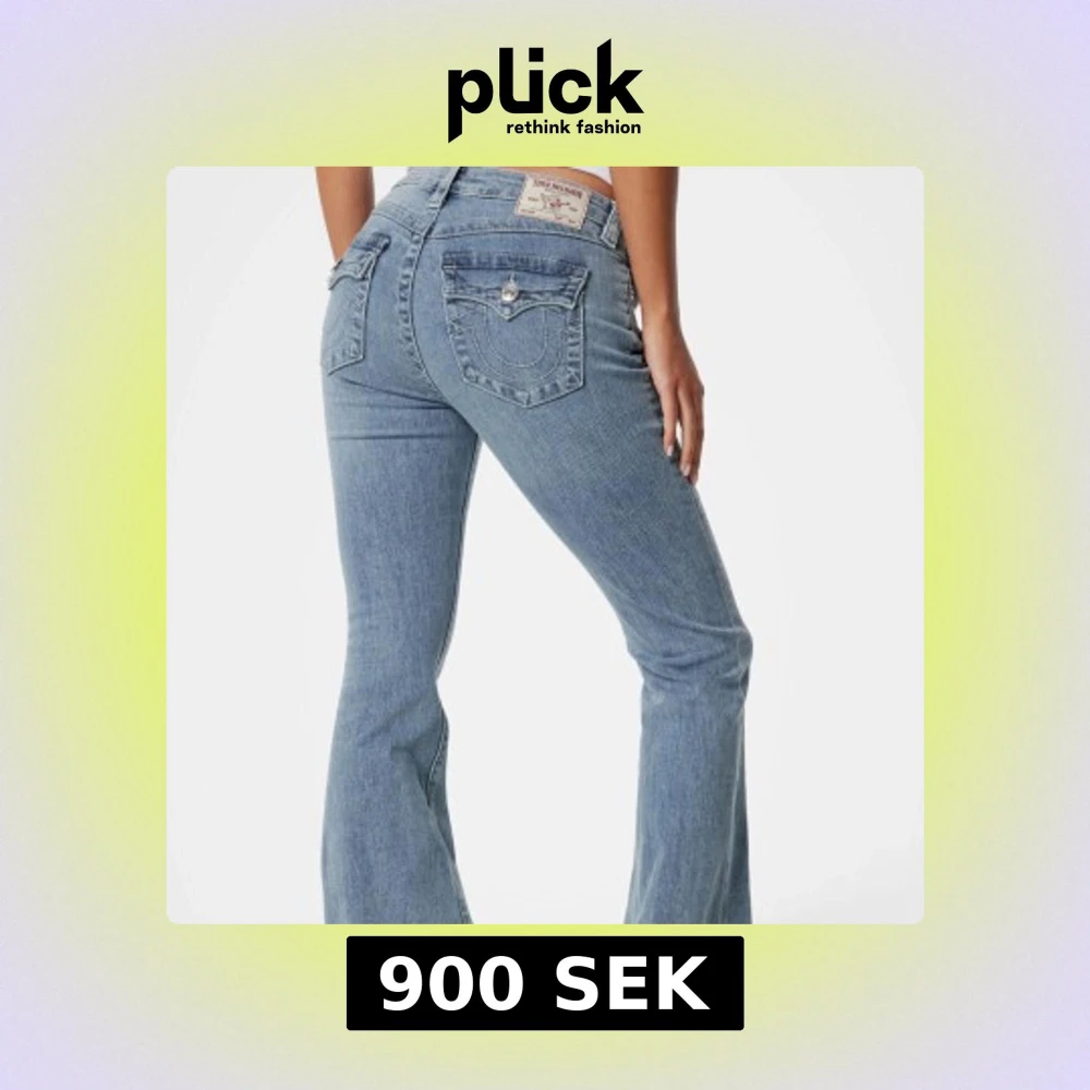 Snygga ljusblå bootcut jeans från True Religion i modell Becca med klassiska fickor och dekorativa sömmar bak. Jeansen har normal passform, med medelhög midja och bootcut passform. Storlek 24/30