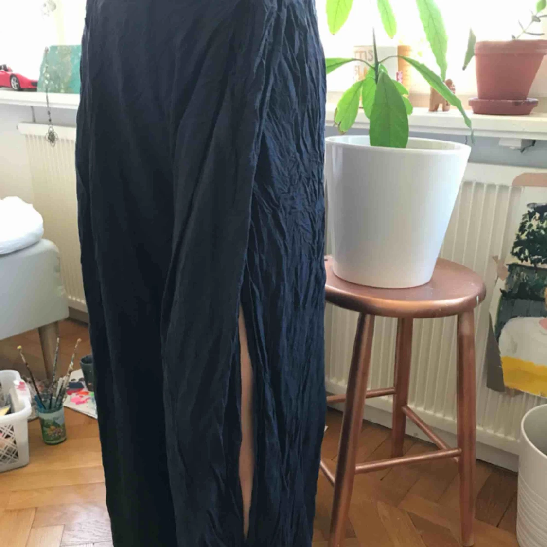 Mörkblåa mjukisbyxor, de är slappa och sköna och har två slitsar vi benen.