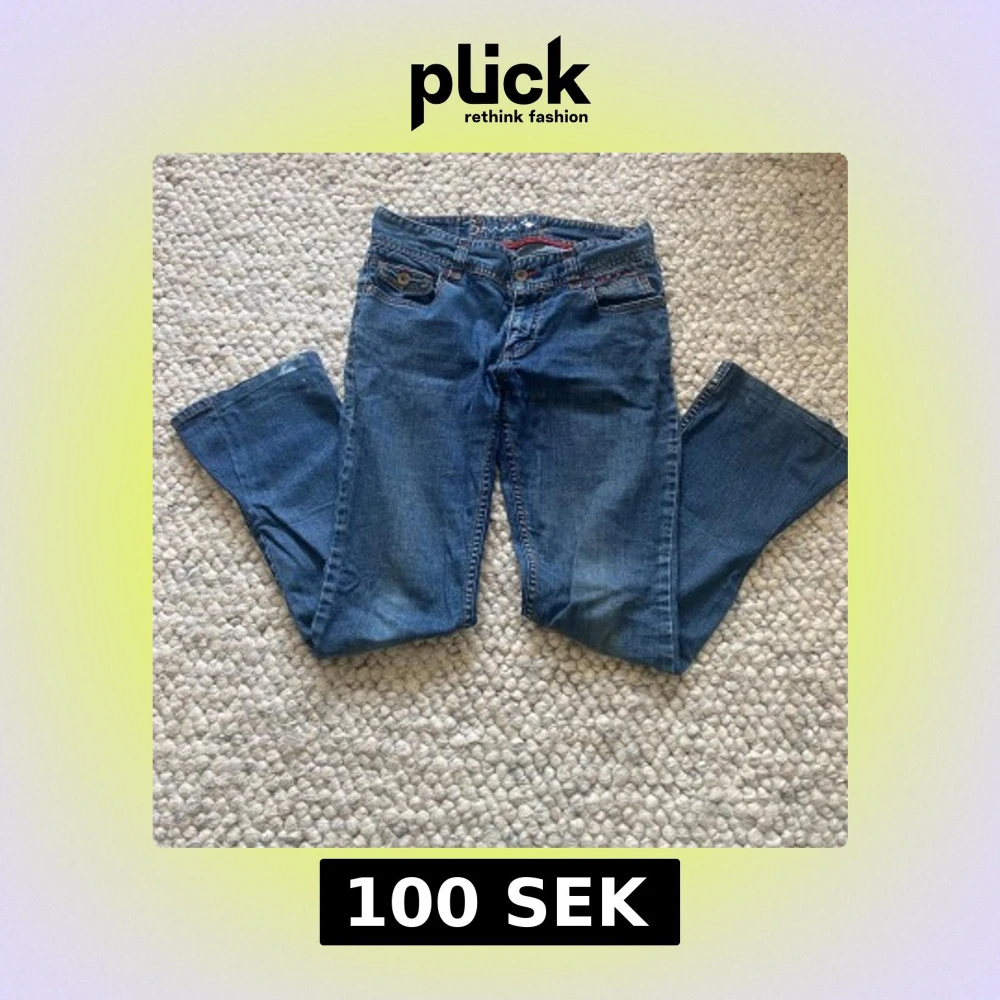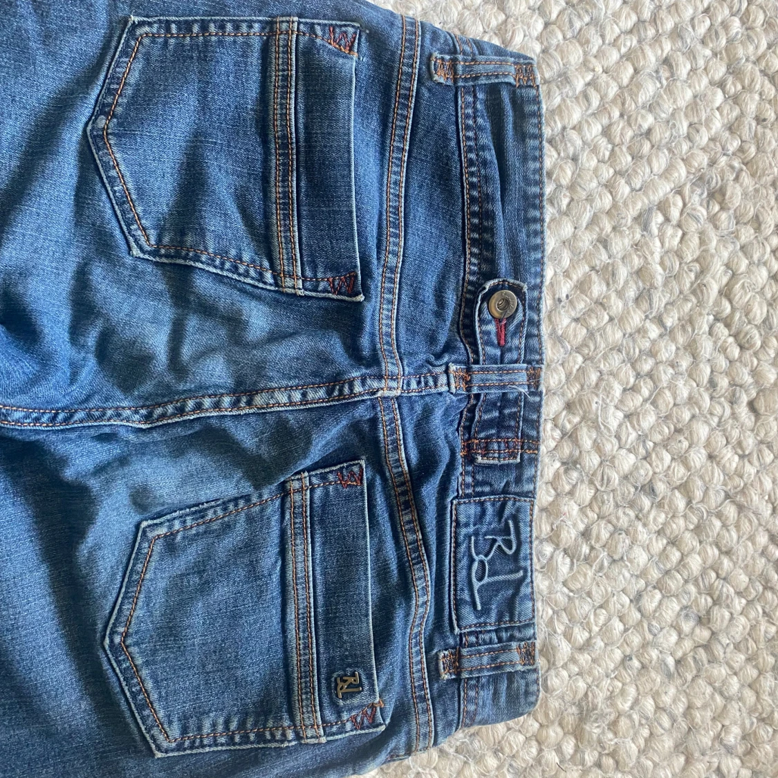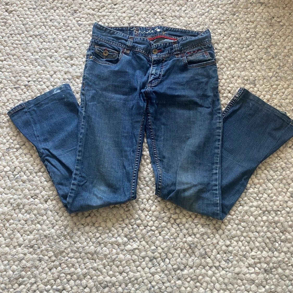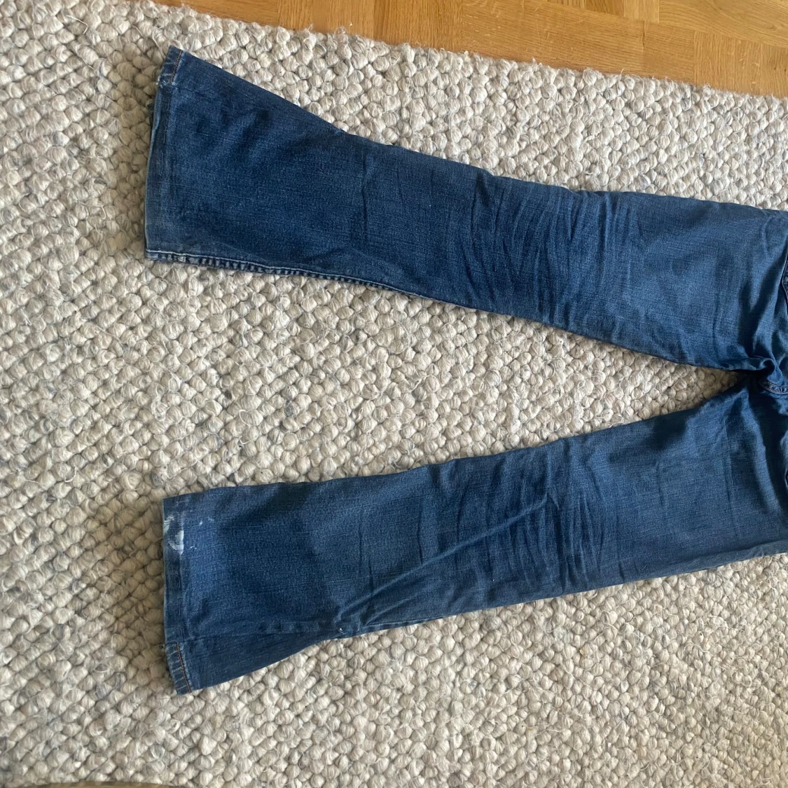 Snygga blå jeans från Bondelid med bootcut . Jeansen har normal midja och är tillverkade i mjukt bomullsjeansmaterial. Några blekta fläckar på höger ben.