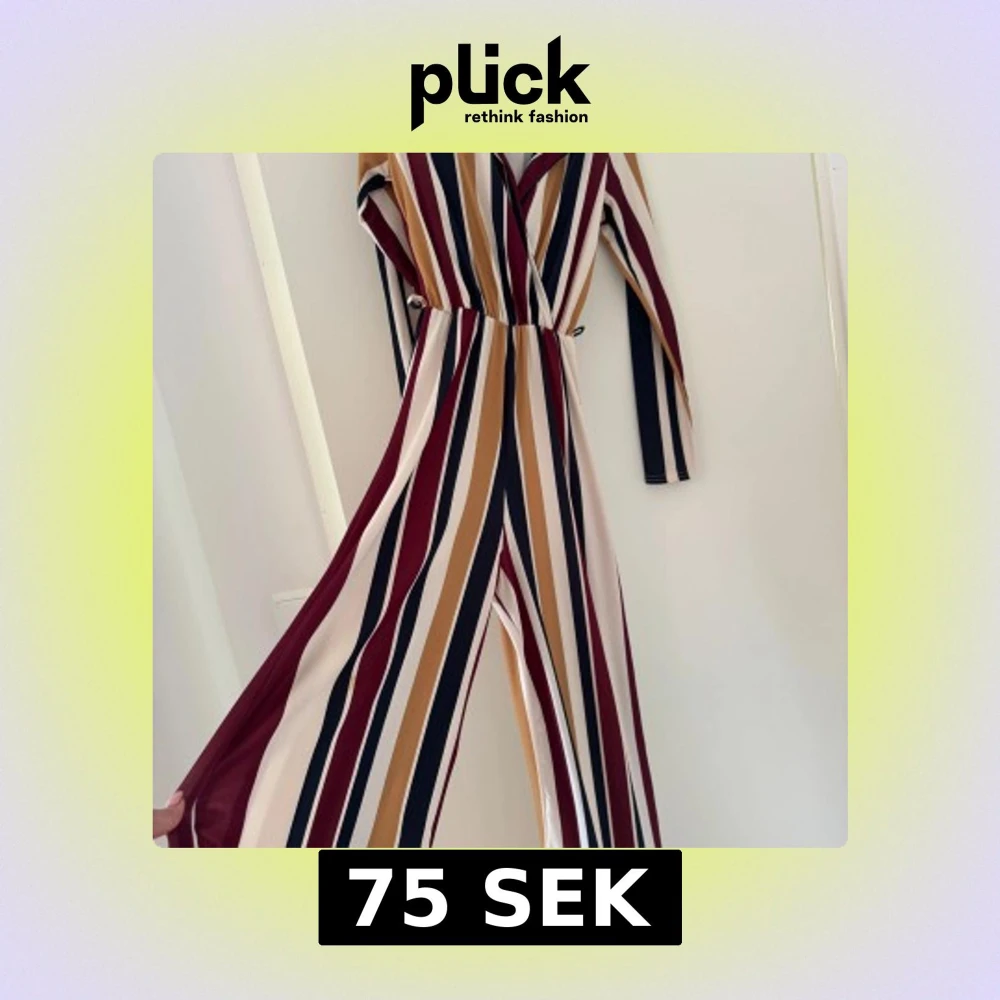 Snygg långärmad byxdress från Boohoo med vertikala ränder i vinrött, marinblått, beige och vitt. Byxdressen har omlott-ringning, resår i midjan och vida ben. Haft ett runt skärp som jag tyvärr inte hittar