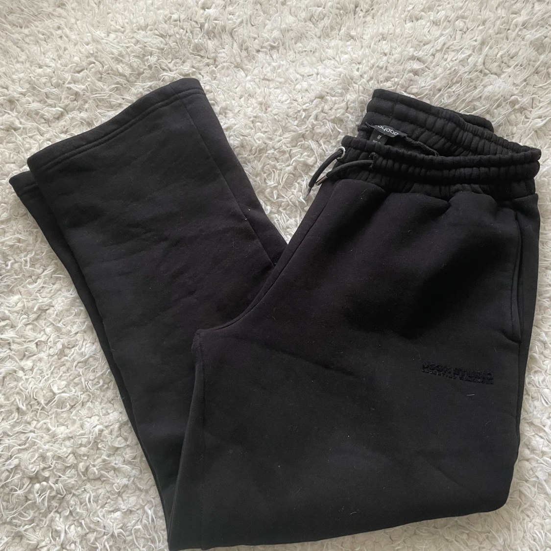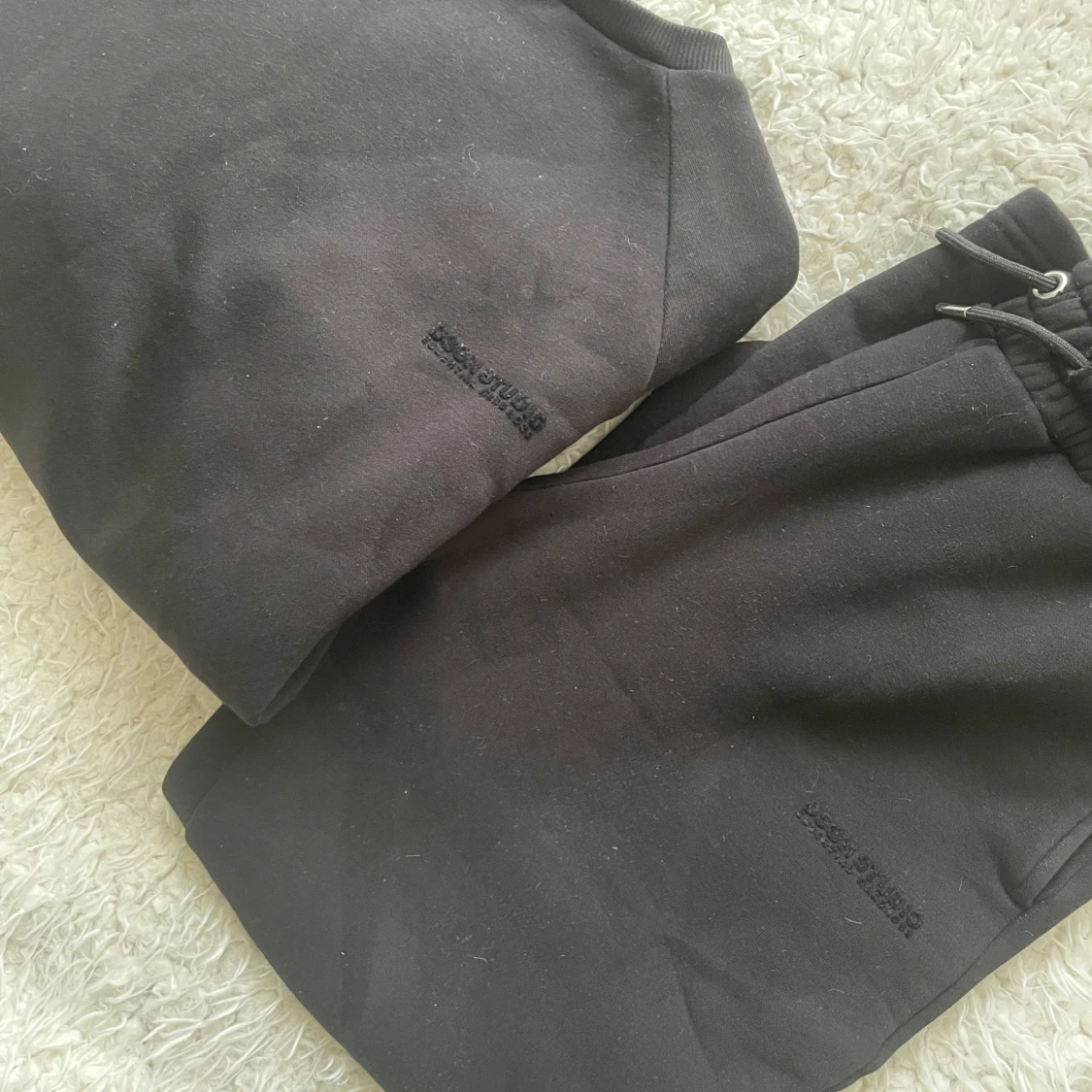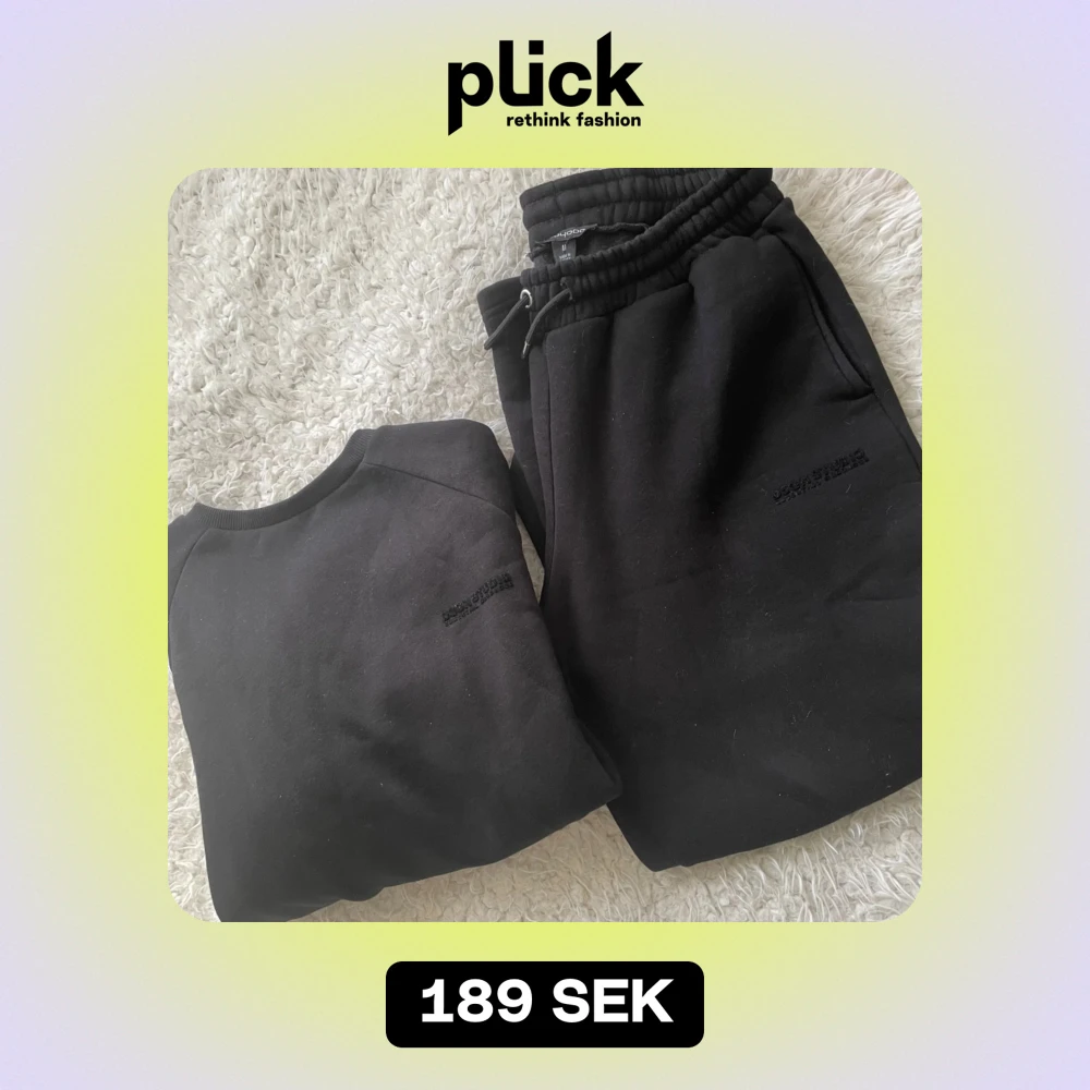 Superfint svart set från Boohoo. Storlek M på byxorna och S på tröjan. Sköna och varma. Byxorna har raka ben och en liten defekt vid bandet. Se bild. Fint skick i övrigt 🖤