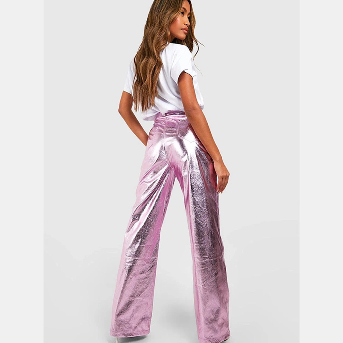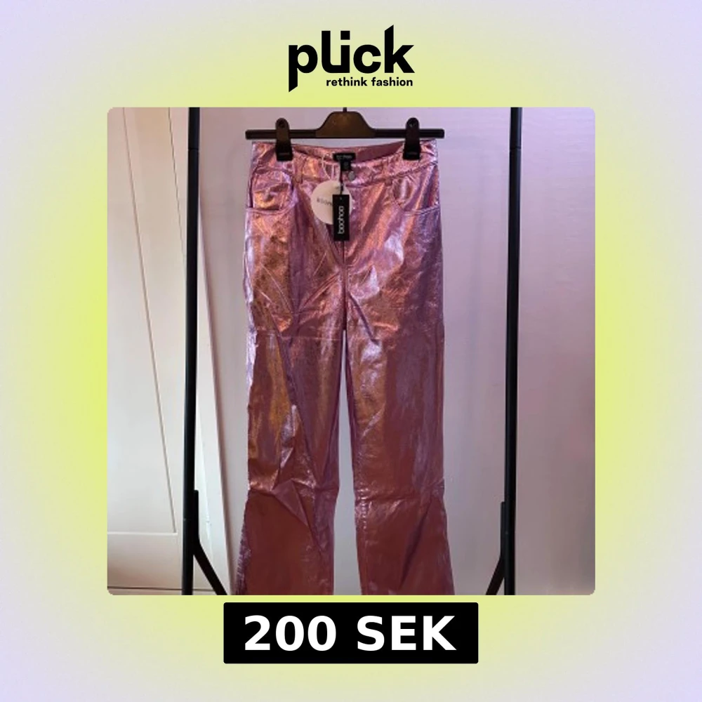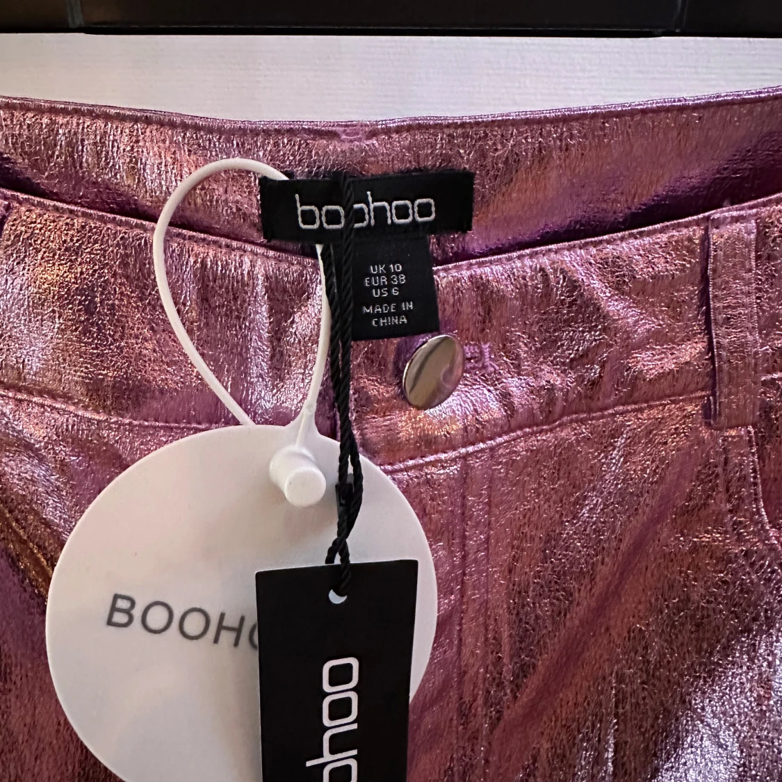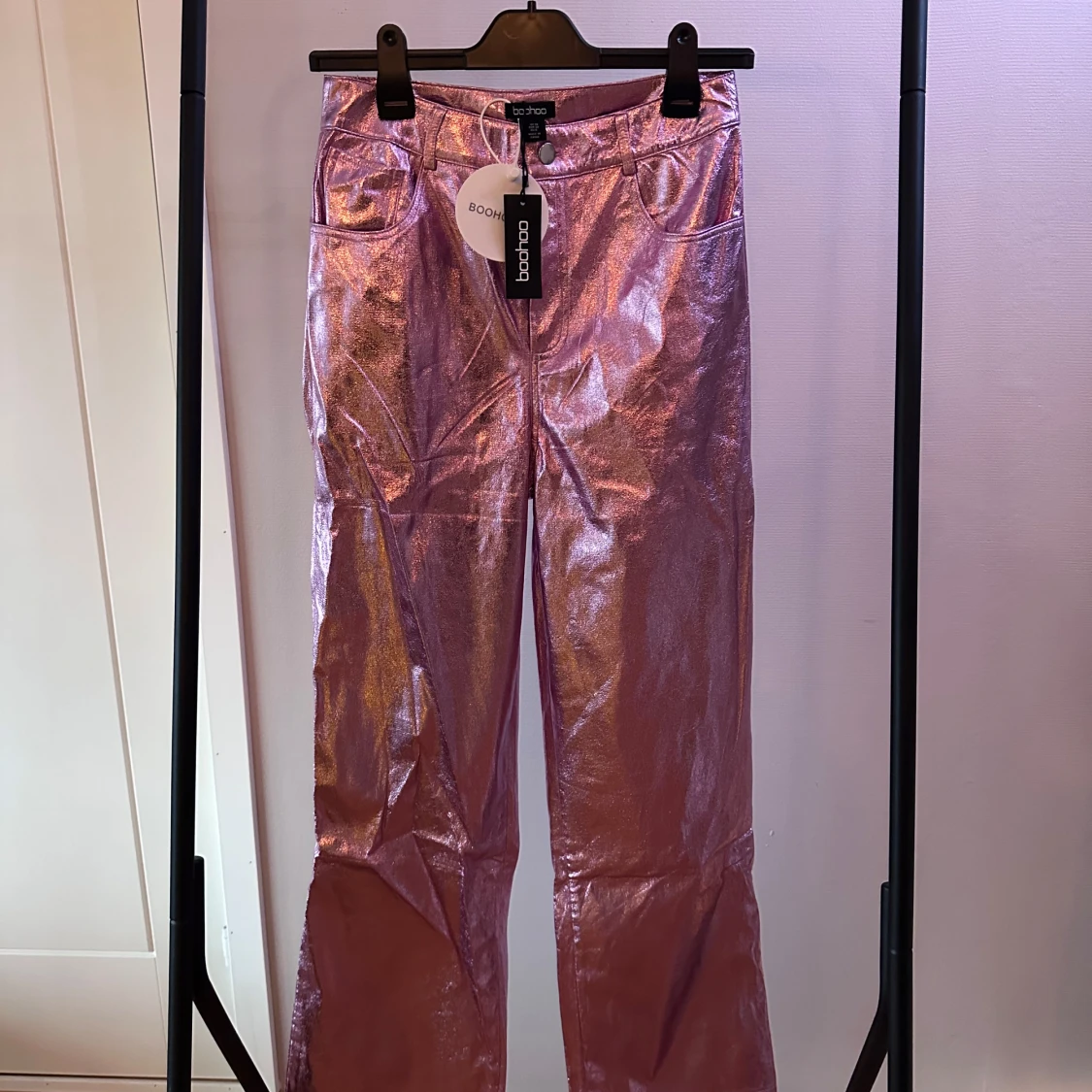 Snygga rosa glittriga byxor från Boohoo i en loose passform. Byxorna har en hög midja och vida ben, vilket ger en trendig look. Perfekta för att sticka ut med sin glittriga finish.