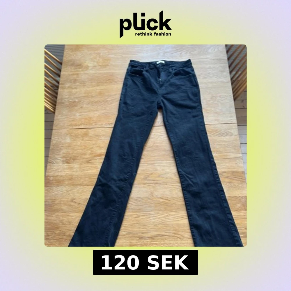Svarta jeansbyxor med bootcut-passform och klassiska fem fickor. Byxorna har dragkedja och knapp framtill och är tillverkade i ett mjukt denimtyg. Perfekta för dig som gillar en tidlös och enkel stil.. används 1 gång då de är för stora.💕💕