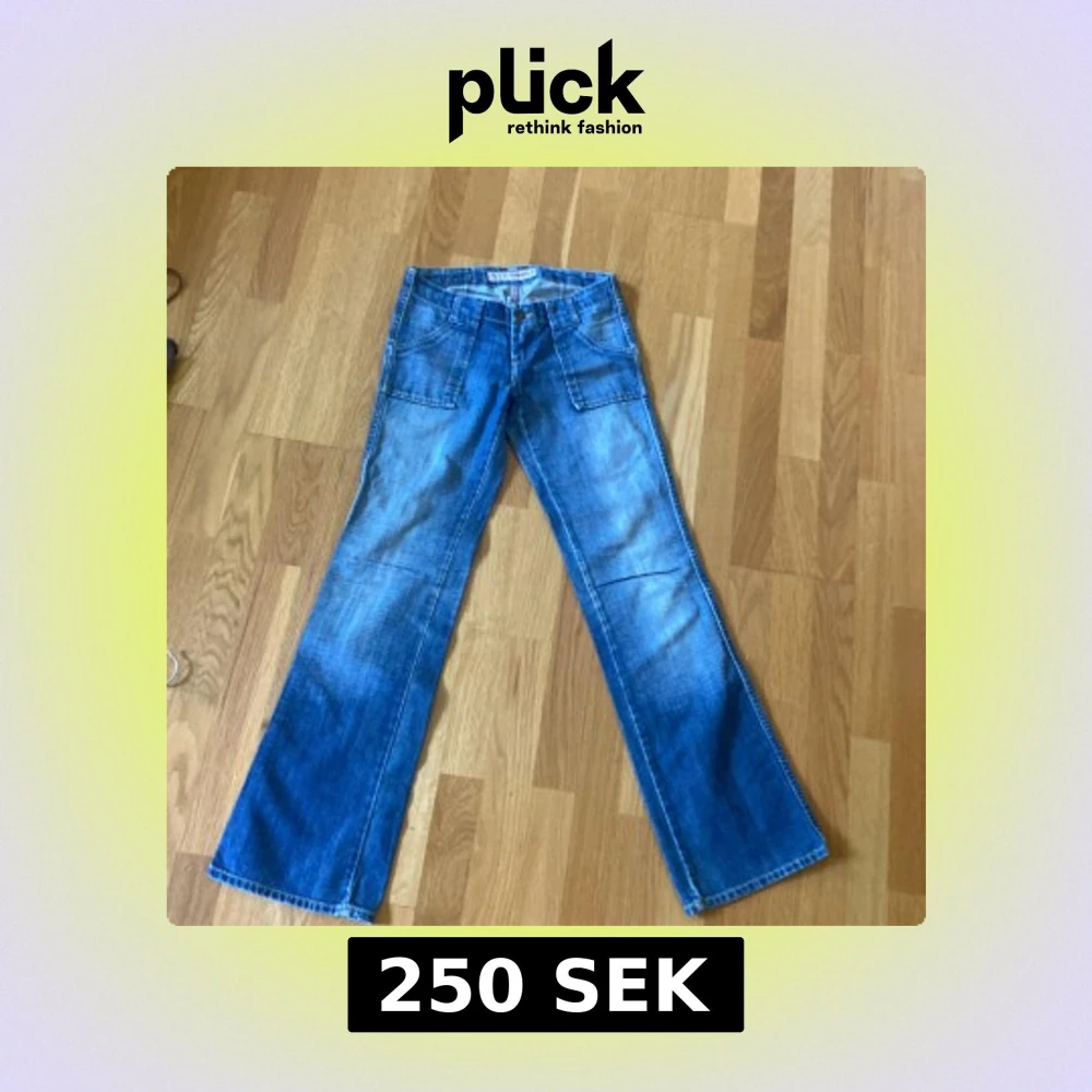 Säljer ett par klassiska blå Lågmidjade bootcut jeansbyxor och stora fickor fram och bak. Jeansen har en utsvängd passform och är tillverkade i denim.