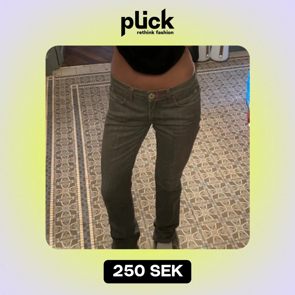 Jag säljer nu mina så fina grå lågmidjade jeans! De är bootcut och i perfekt skick. De är storlek 34 och passar mig som är va 168 cm. Köpta i Paris. De har lite färgade sömmar och en extra ficka bak. Kom privat för fler bilder eller vid frågor💘