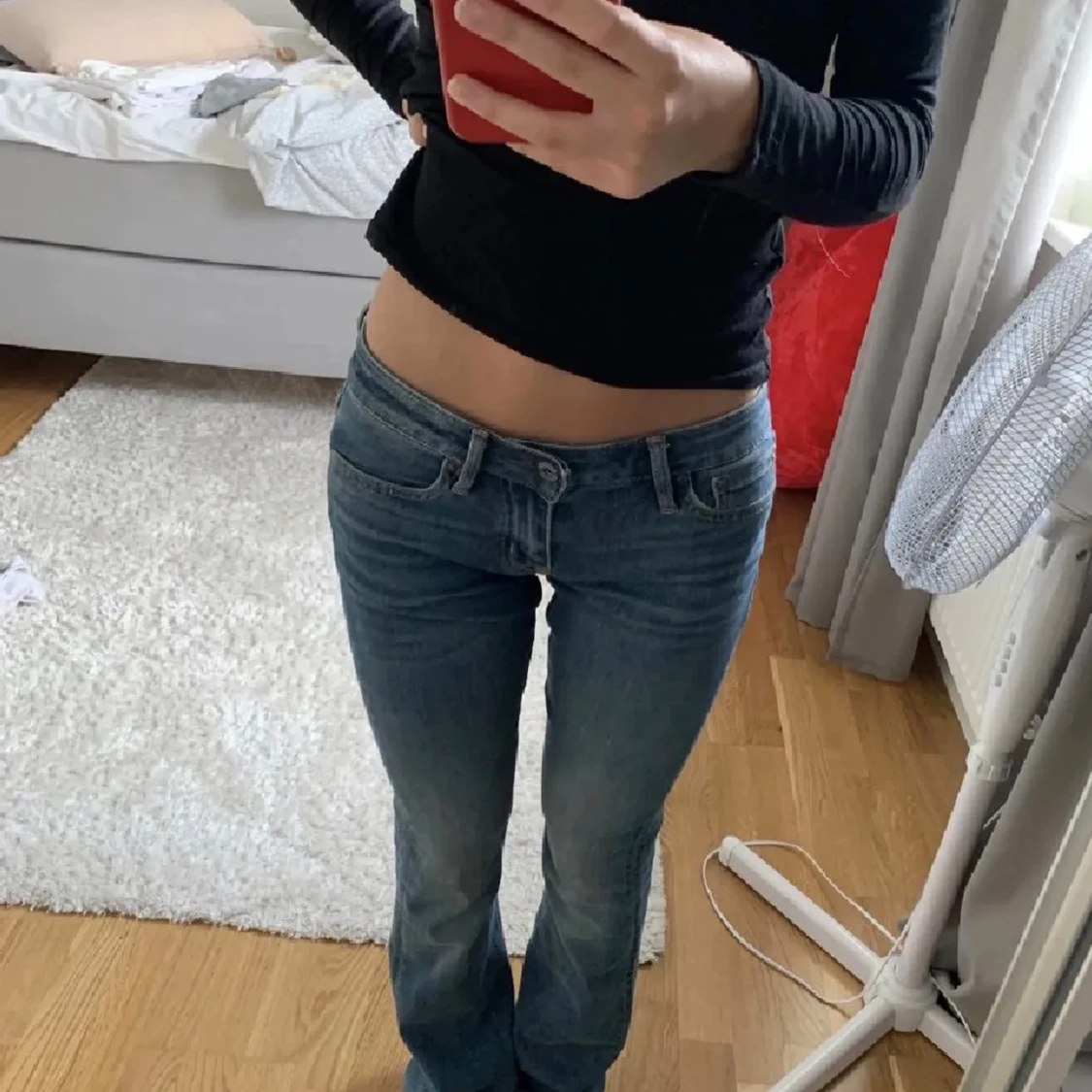 Storlek 25/34. Snygga blå jeans med låg midja och bootcut-snitt. Jeansen har klassisk femficksdesign och en lätt tvättad look. Perfekta för dig som gillar en avslappnad och trendig stil. Nypris 999kr, endast lite slitningar nere vid hälen.