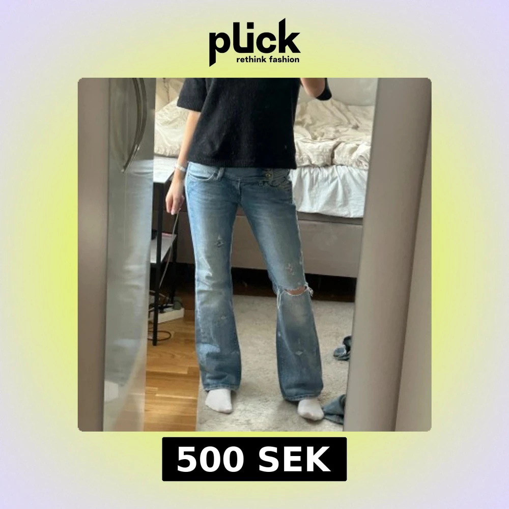 Snygga blå bootcut jeans från diesel med slitna detaljer och låg midja. Jag är 168cm❤️ Midja: 40 cm Innerbenslängd: 77cm