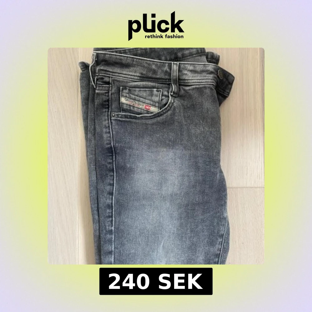 Säljer ett par grå bootcut jeans från Diesel med klassisk femficksdesign och diskret logga på myntfickan. Jeansen har en bootcut passform och låg midja, perfekta till vardags. Snyggt tvättad finish för en avslappnad look. Passar S-M.