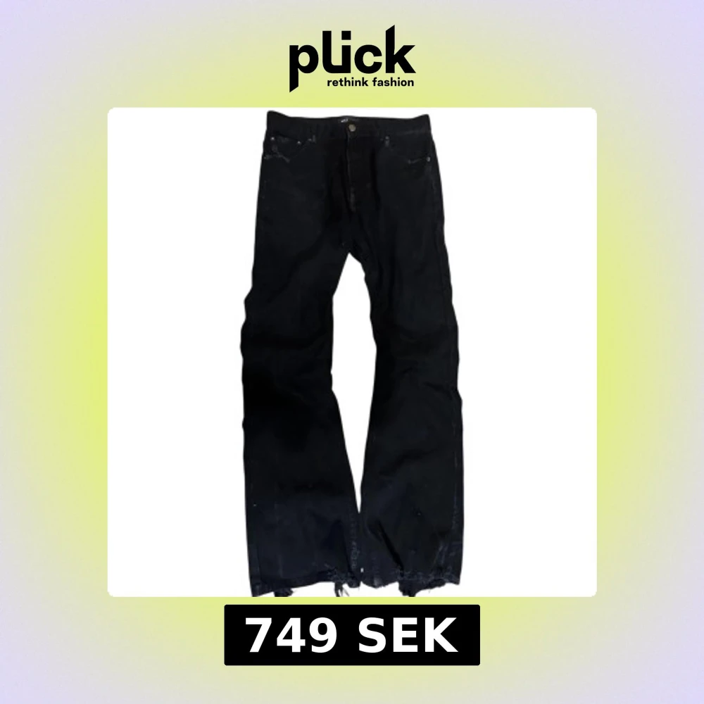 Feta flared/bootcut jeans med med bra passform det står L på storleken men de passar mer S eller M de är distressed vid benöppningen och på fickan har du några frågor är det bara att fråga på pris är inte fast vid snabb affär