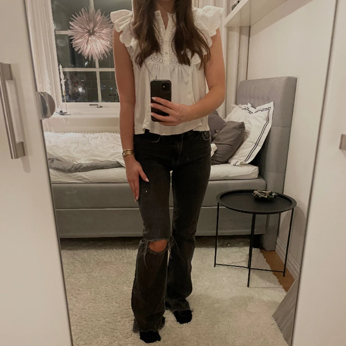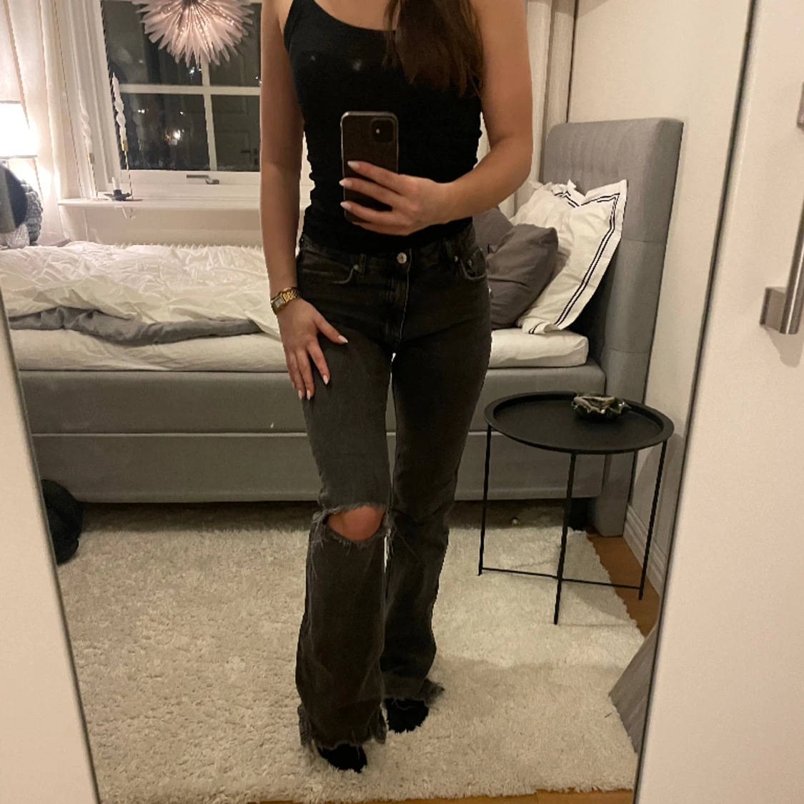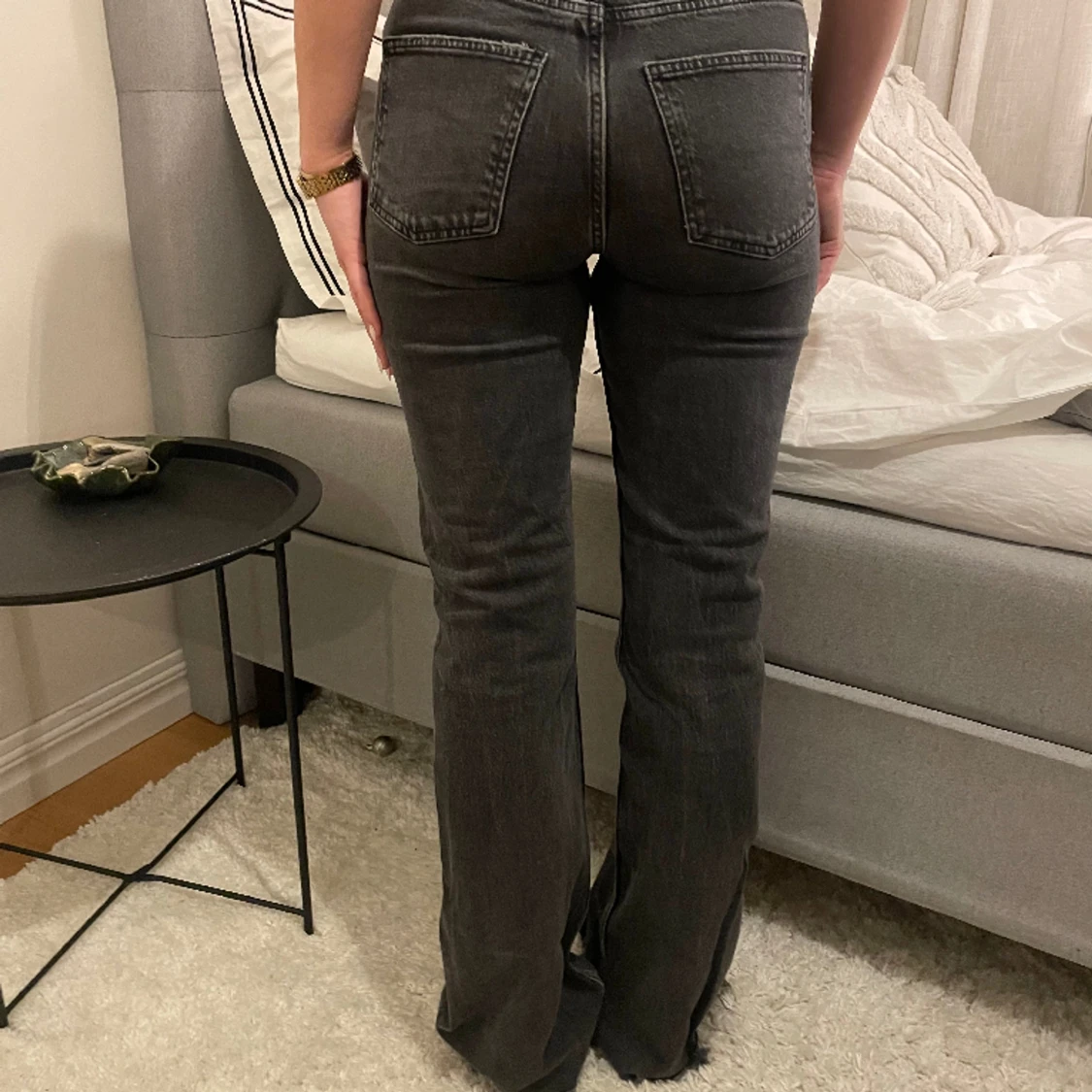 Dessa grå/svarta jeansen är i storlek 38 och säljs då de inte längre kommer till användning. Jag skulle påstå att dessa jeans i midwaist.
