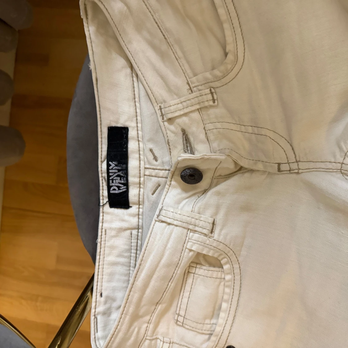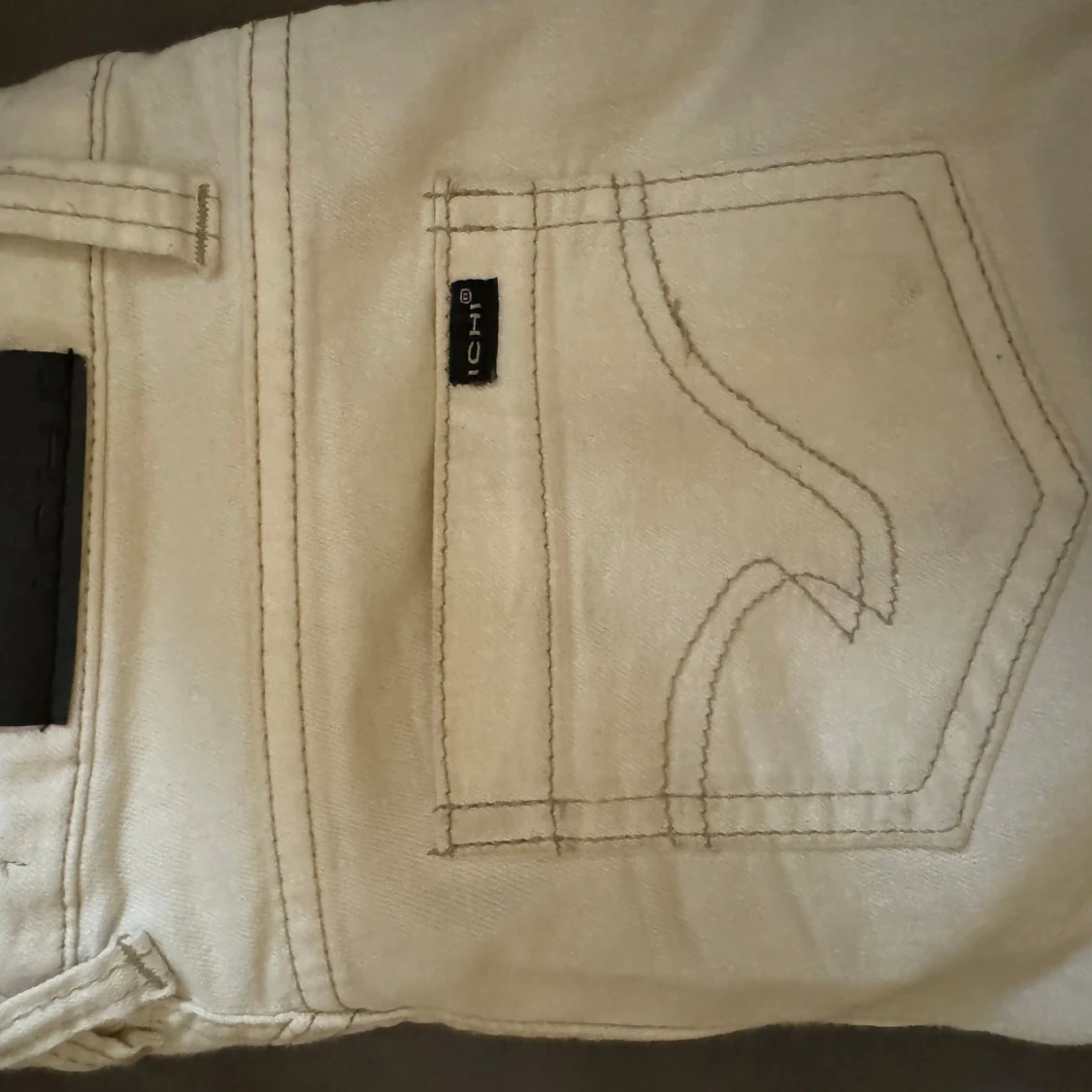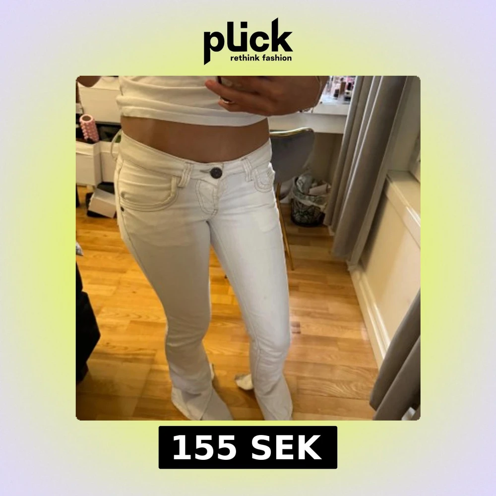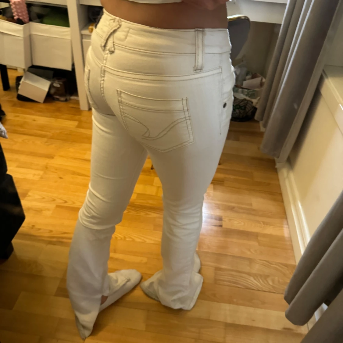 Snygga vita jeansbyxor från denim wear med en tight passform. Byxorna har en klassisk femficksdesign och en knappgylf. Perfekta för en stilren look. De är uppklippta där nere eftersom jag tyckte de satt för skinny. Säljer för de har blivit för små!