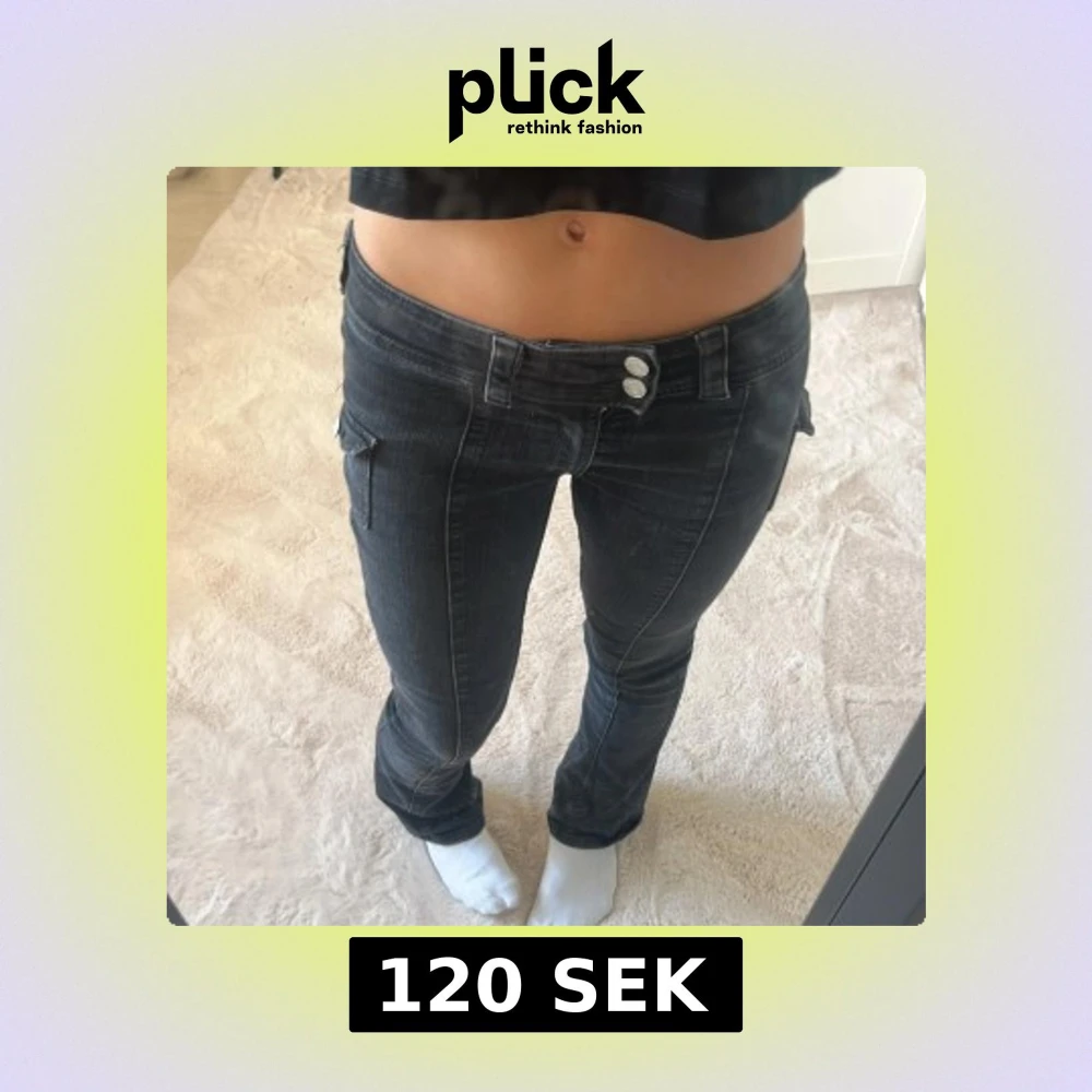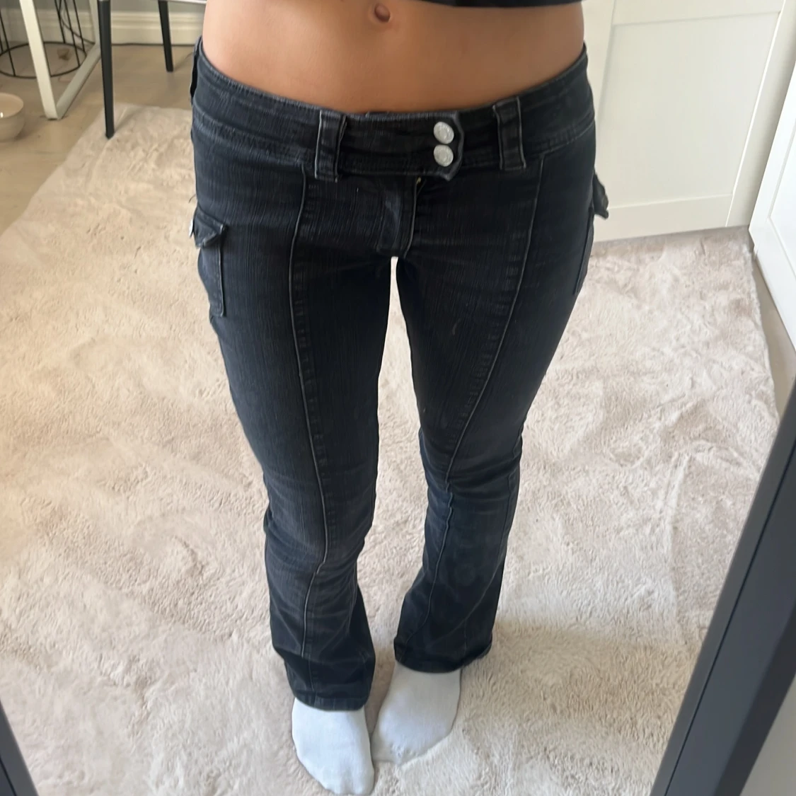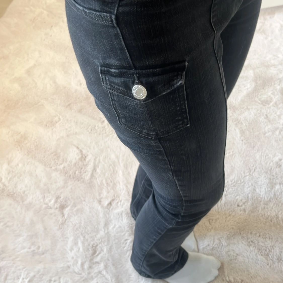 Säljer ett par svarta jeans med låg midja och raka ben. Byxorna har coola cargofickor på sidorna med knappdetaljer och dubbla knappar i midjan. Jeansen är i stretchigt denim och har en snygg, mörk tvätt som passar till allt. På bilden 164 cm lång💕