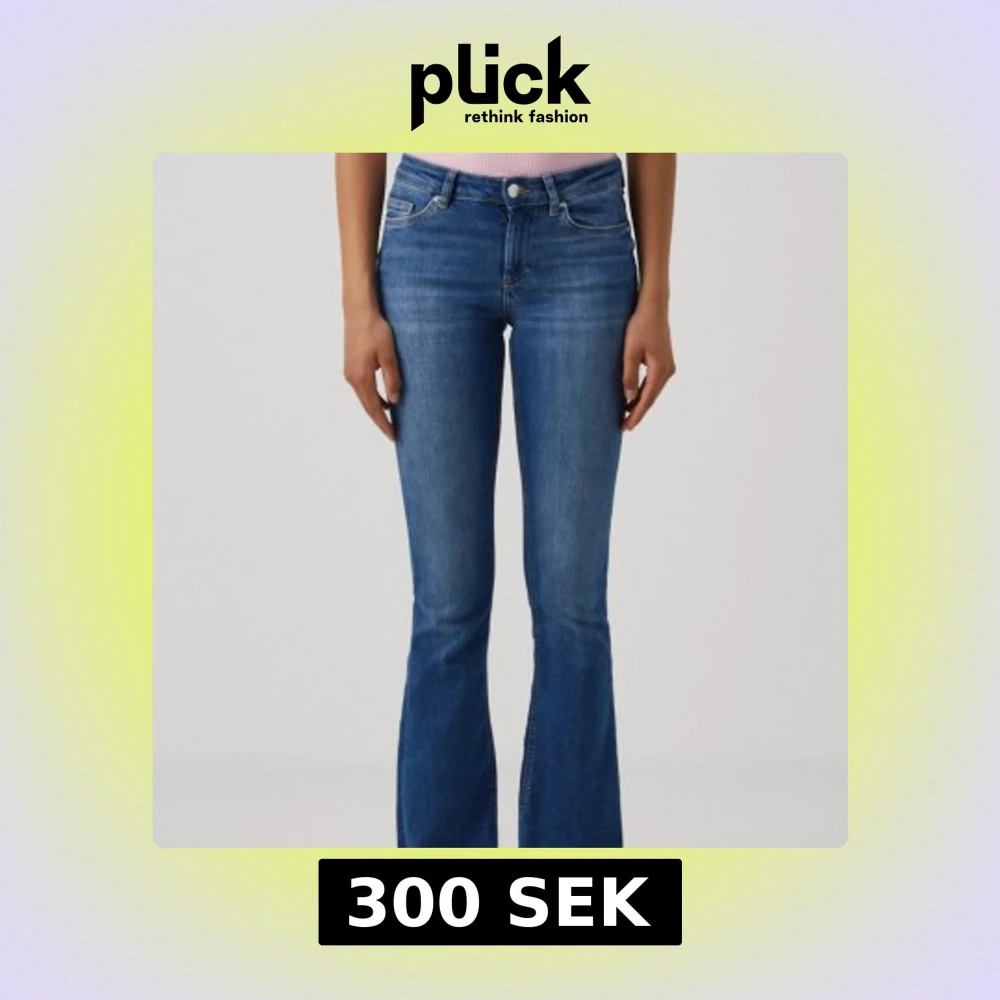 Snygga blå bootcut jeans med en klassisk femficksdesign och knappgylf. Perfekta för en avslappnad stil med en touch av retro. Passar bra till både sneakers och klackar. Strl S/30