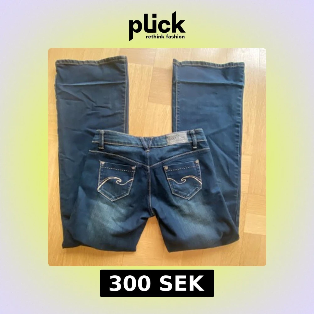 Snygga mörkblå jeans med unika broderade detaljer på bakfickorna. Knappt använda och köpta utomlands. 36cm rakt över midjan och 80cm innerbenslängd. Inte sönder någon stans utan bara vikta längst ner för de var för långa för mig, det är därför det är ett jack där. Det försvinner av sig själv, har bara haft de vikta ett tag