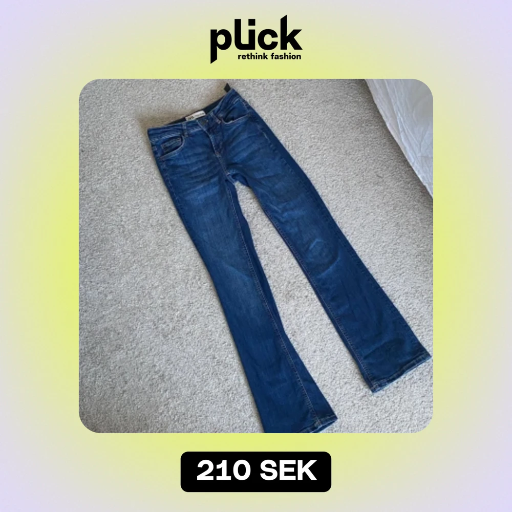 Ett par mörkblåa jeans från zara. De är midwaist, har använt de ett par gånger men de är i gott skick. Midjemåttet är 34 cm (tvärs över) och innerbenslängden är ca 80 cm. Skriv för fler frågor!