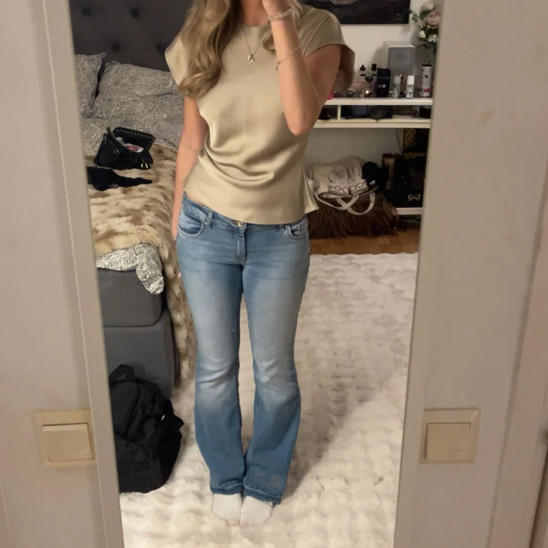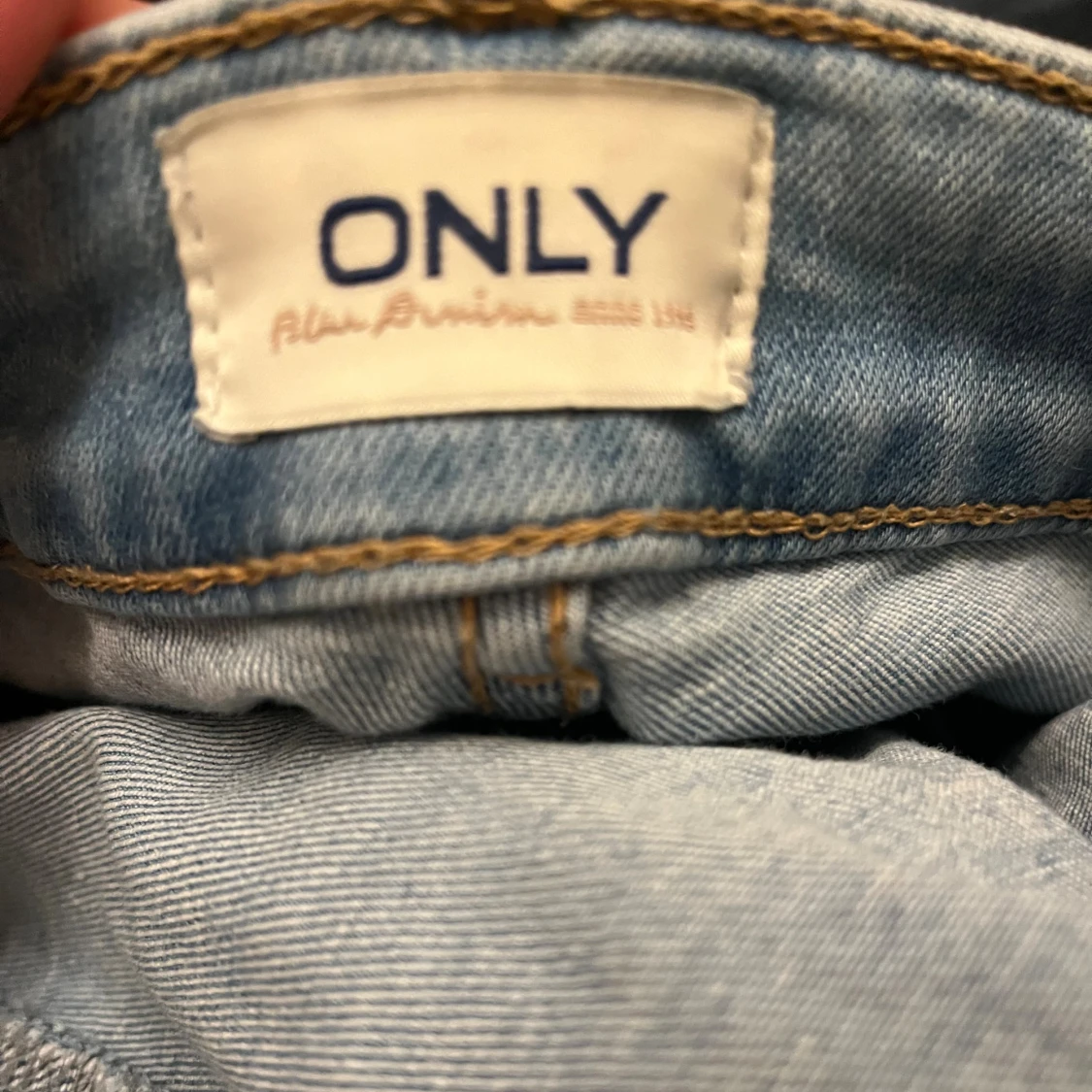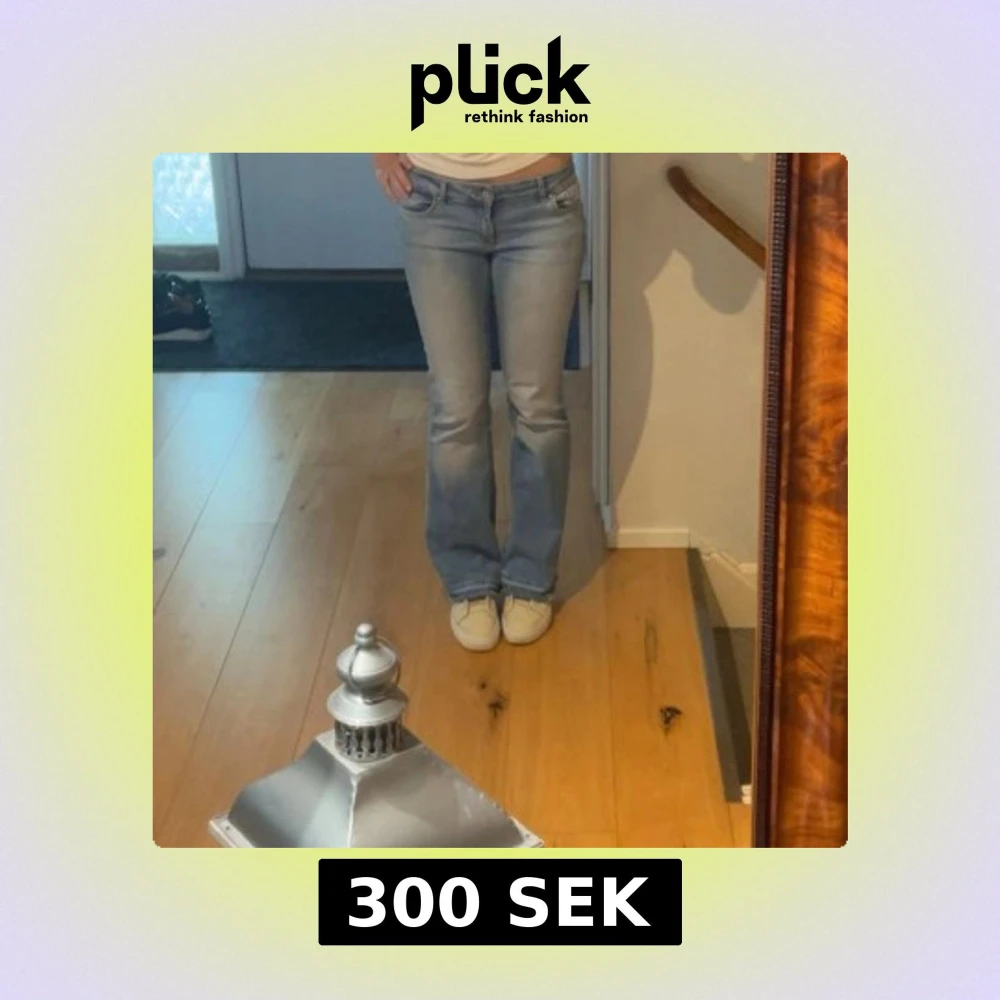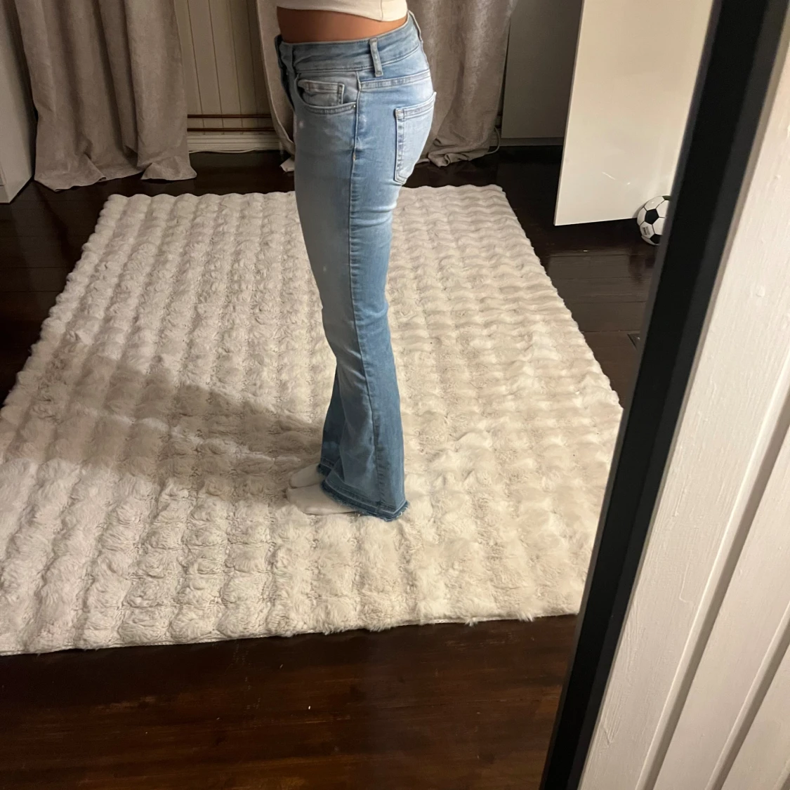 Säljer ett par snygga ljusblå bootcut jeans från ONLY. Jeansen har klassisk femficksdesign, låg midja och är tillverkade i mjuk denim. Midjemåttet är 33cm och Innerbensmåttet är 75cm