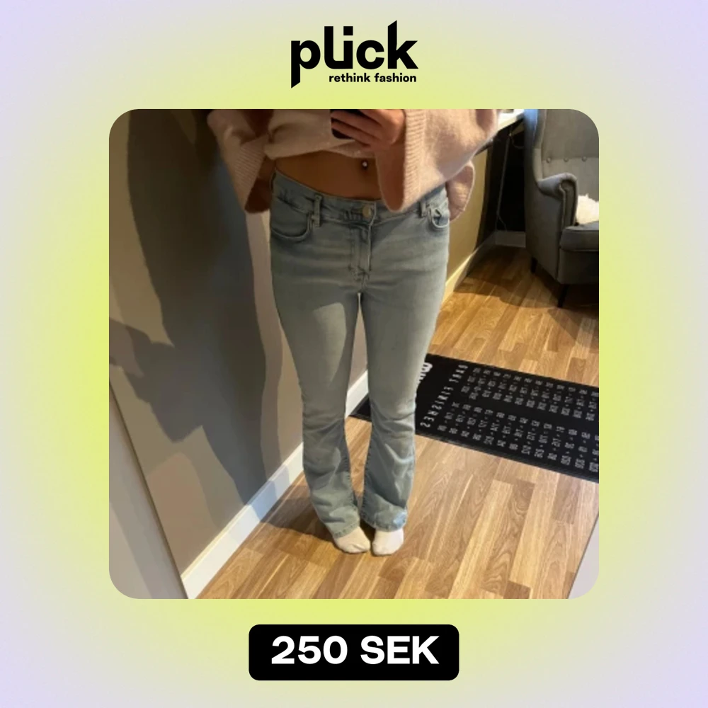 Säljer ett par ljusblåa mid waist bootcut jeans från bikbok då de är lite stora för mig. Köpt nya och väldigt sparsamt använda. Storlek waist M length 31.