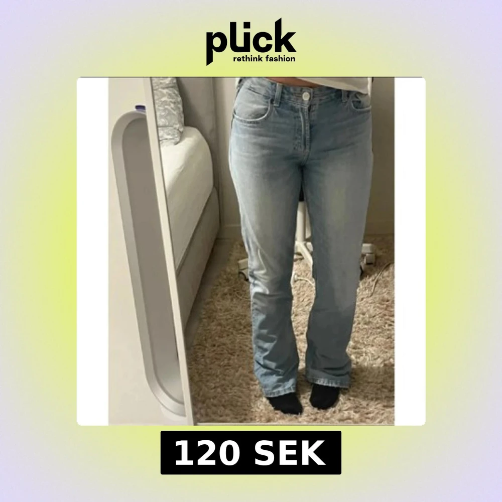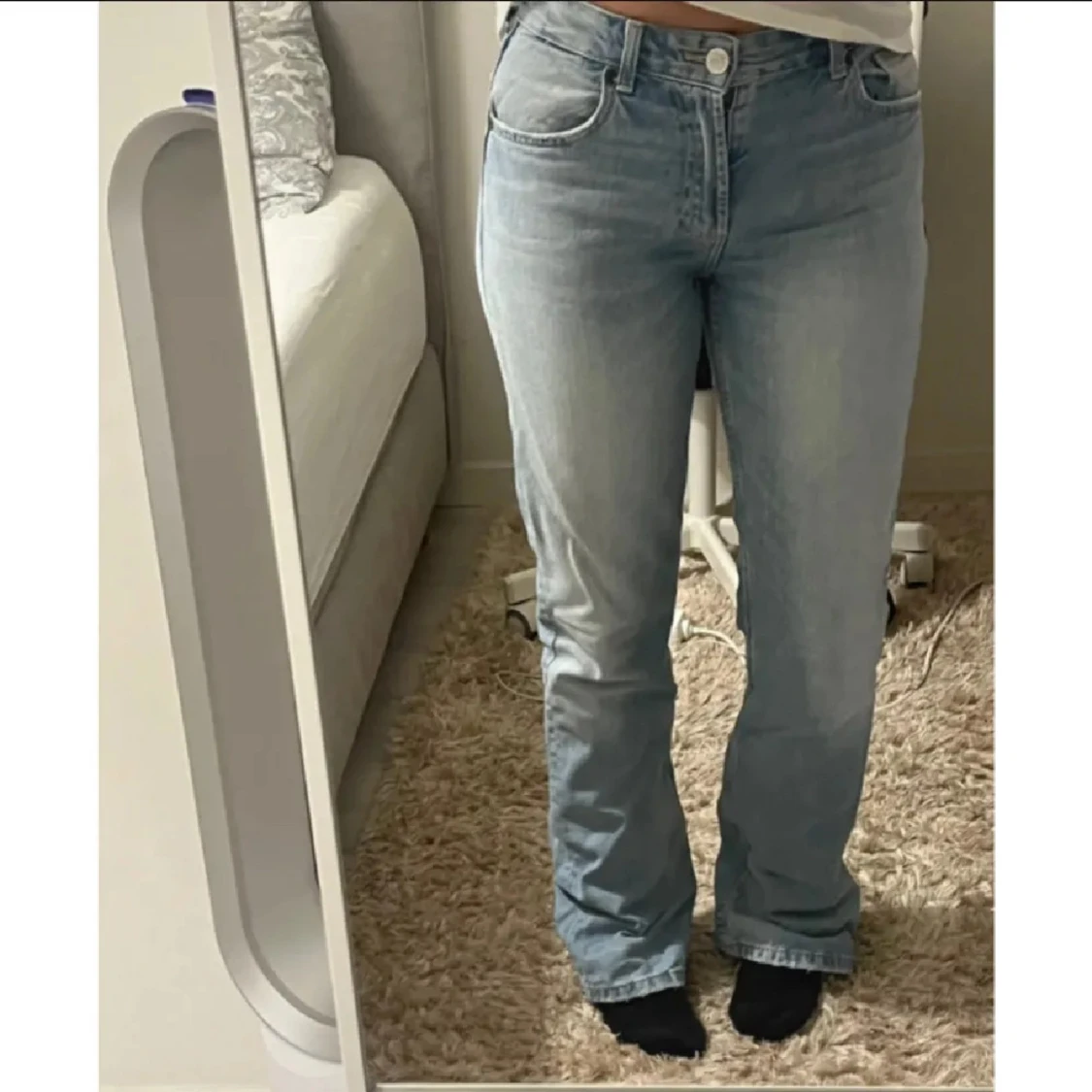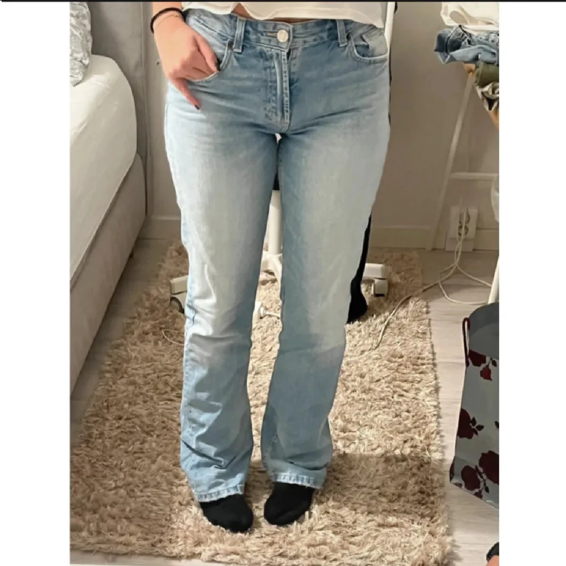Bootcut jeans i ljusblå tvätt från Zara Köpta här på vinted, dem är använda fåtal gånger av mig, men de är i fint skick. Strl 36