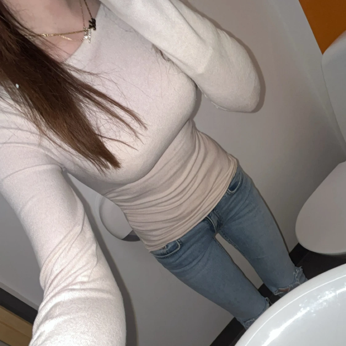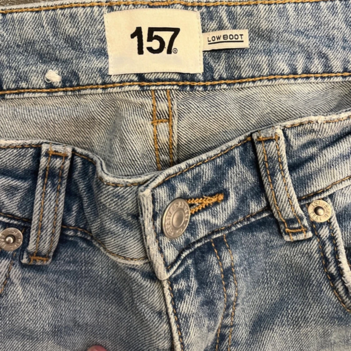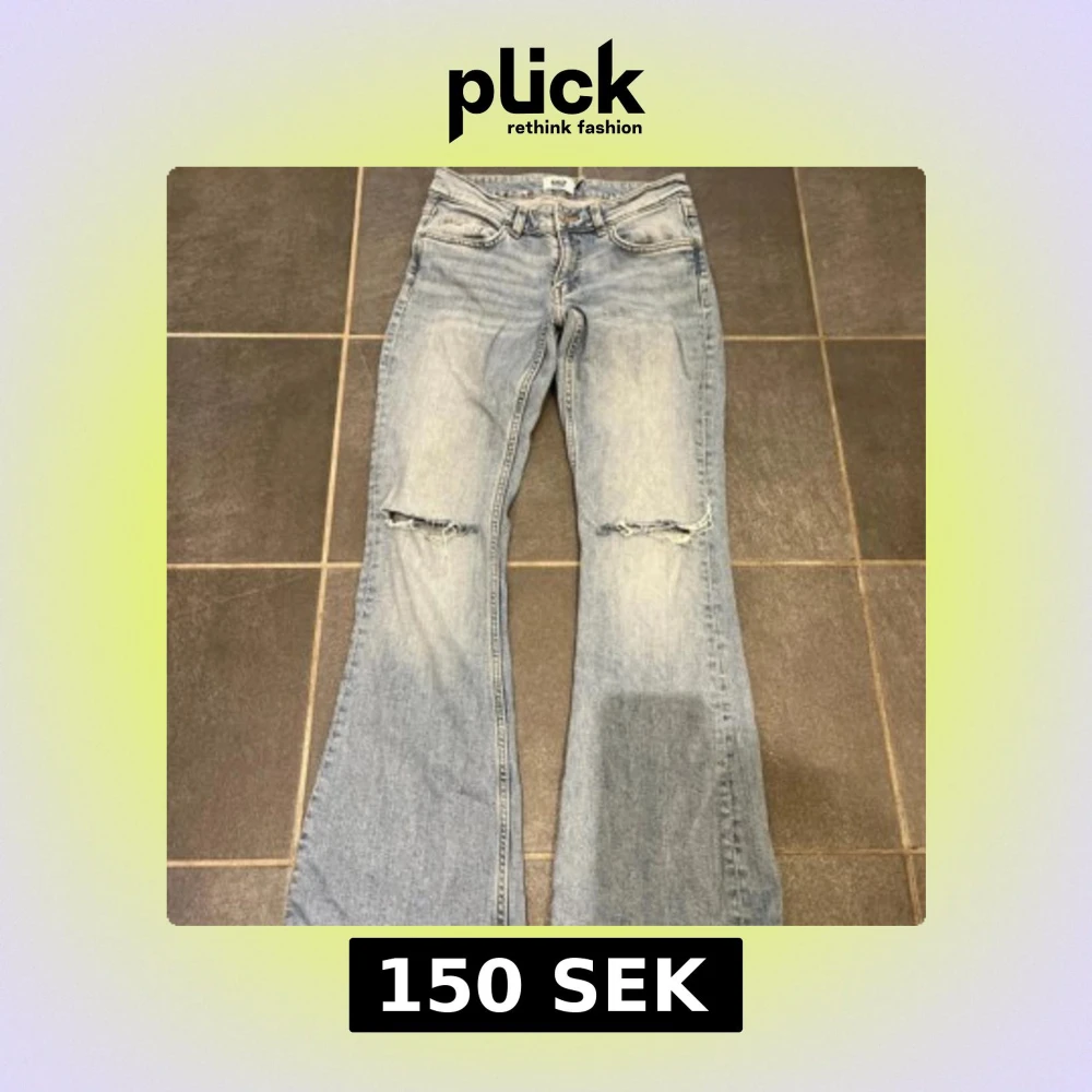 Säljer ett par ljusblå bootcut jeans från 157 med låg midja och slitna detaljer vid knäna. Jeansen har klassisk femficksdesign, dragkedja och knapp framtill. Materialet är jeans med snygg tvättad look och lite stretch för skön passform.