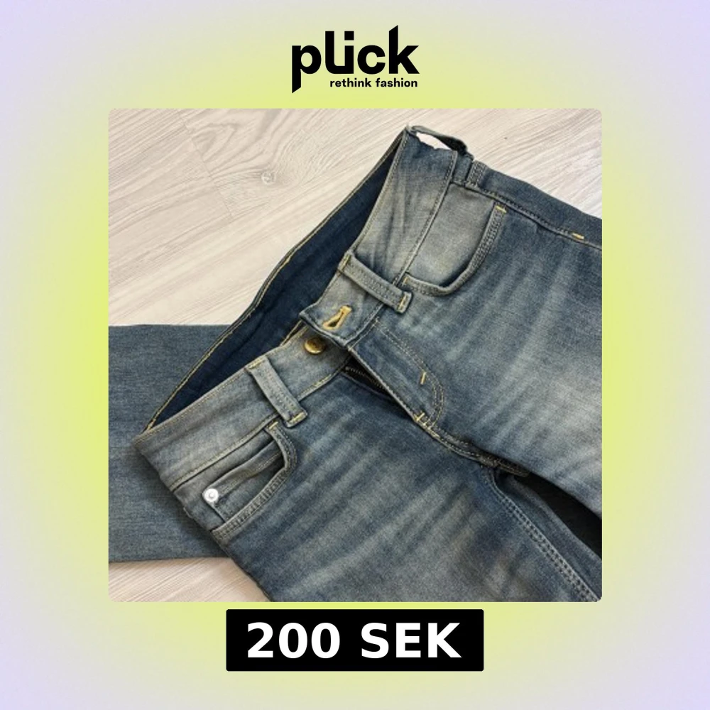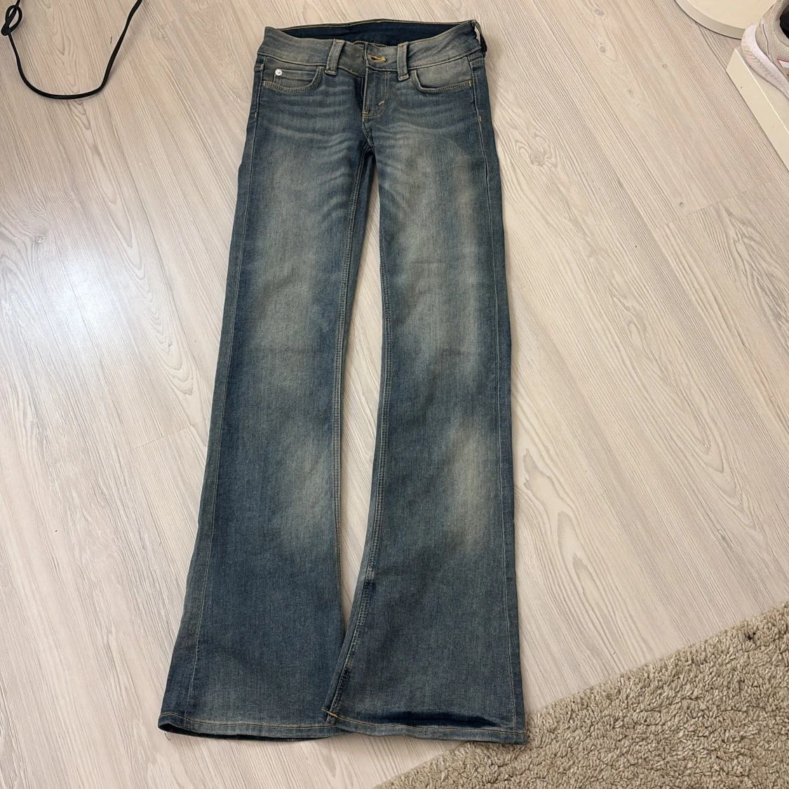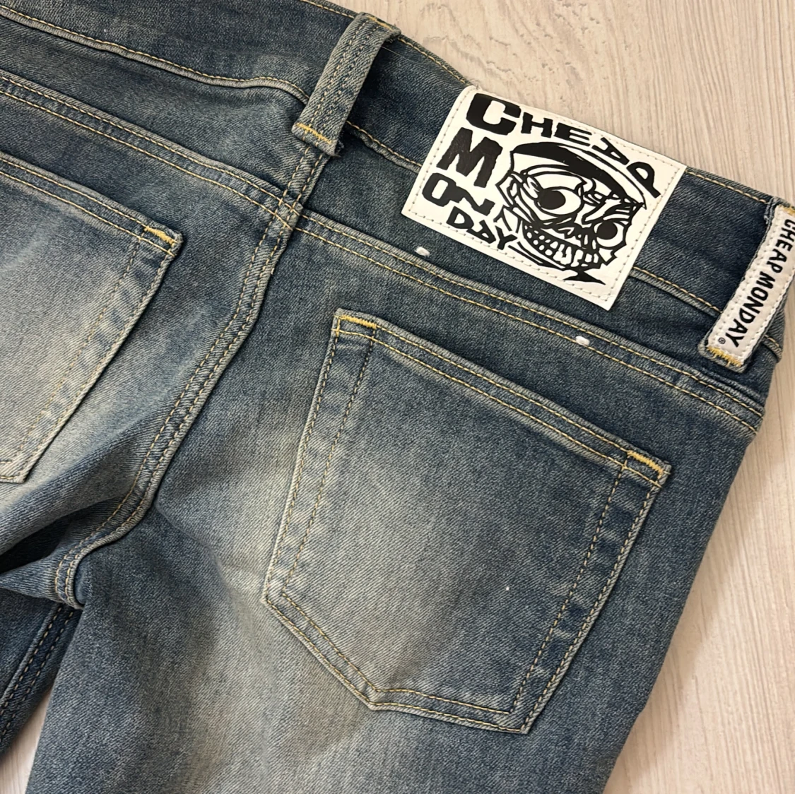 Snygga blå bootcut jeans från Cheap Monday med slitna detaljer och klassisk femficksdesign. Jeansen har en ljus tvätt och tydliga kontrastsömmar samt det ikoniska Cheap Monday-märket bak i midjan. Aldrig använt