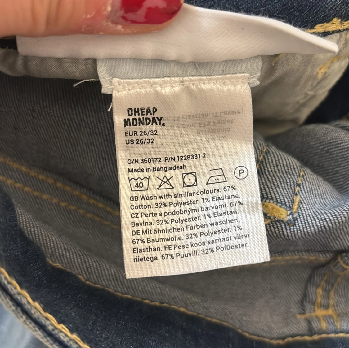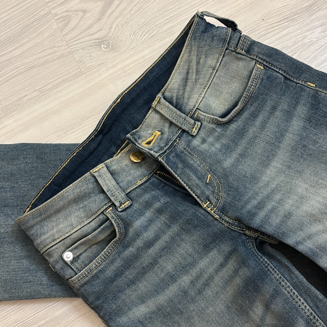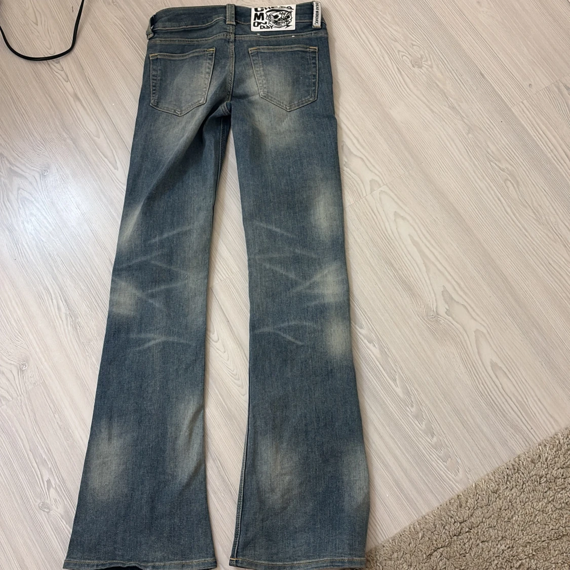 Snygga blå bootcut jeans från Cheap Monday med slitna detaljer och klassisk femficksdesign. Jeansen har en ljus tvätt och tydliga kontrastsömmar samt det ikoniska Cheap Monday-märket bak i midjan. Aldrig använt