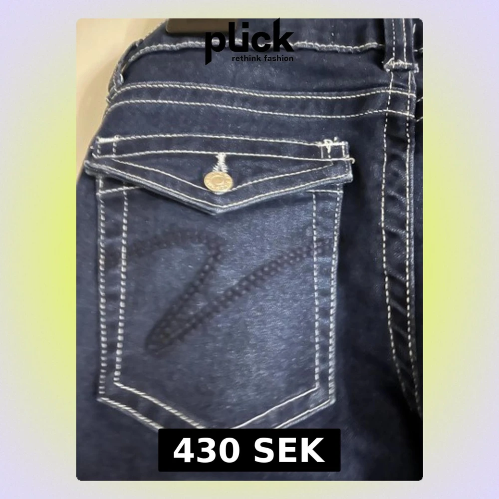 Mörkblå bootcut jeans med kontrasterande vita sömmar och snygga fickdetaljer med lock och knapp bak. Klassisk femficksmodell i stretchig denim som sitter skönt och ger en cool siluett. Perfekt för dig som gillar retrovibbar och markerade detaljer.