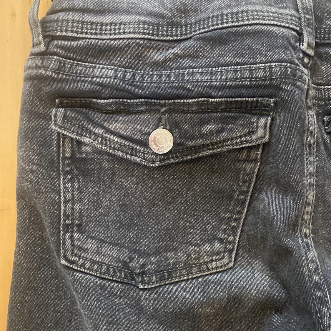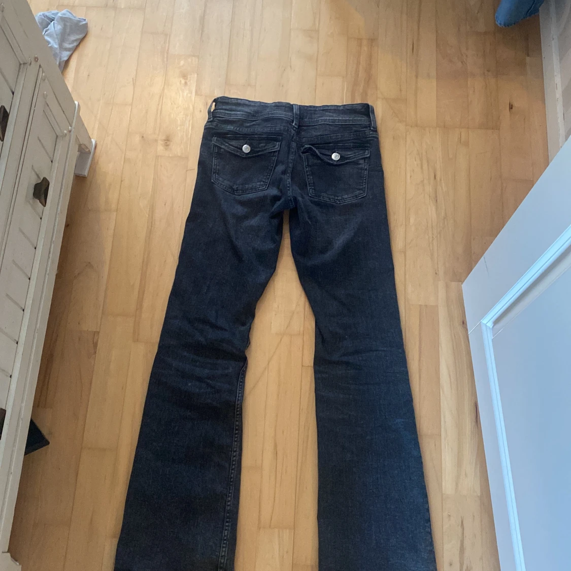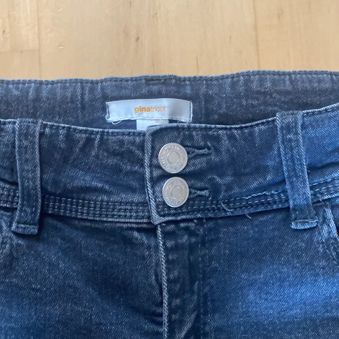 MörkGråa bootcut jeans från Gina Tricot med klassisk femficksdesign och dubbla silverknappar i midjan. Jeansen har breda benslut och snygga detaljer på bakfickorna. Perfekt för dig som gillar retrovibbar och vill ha en cool siluett.