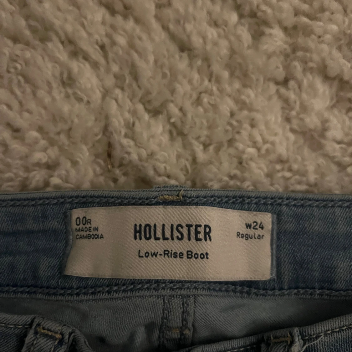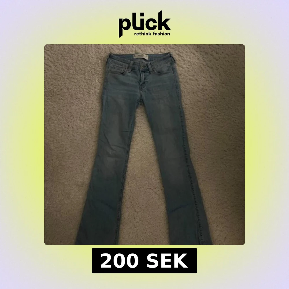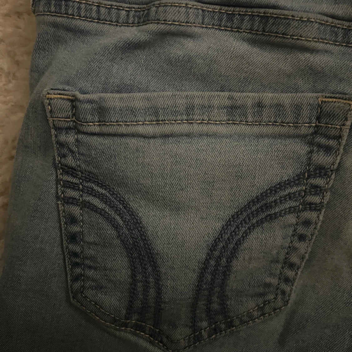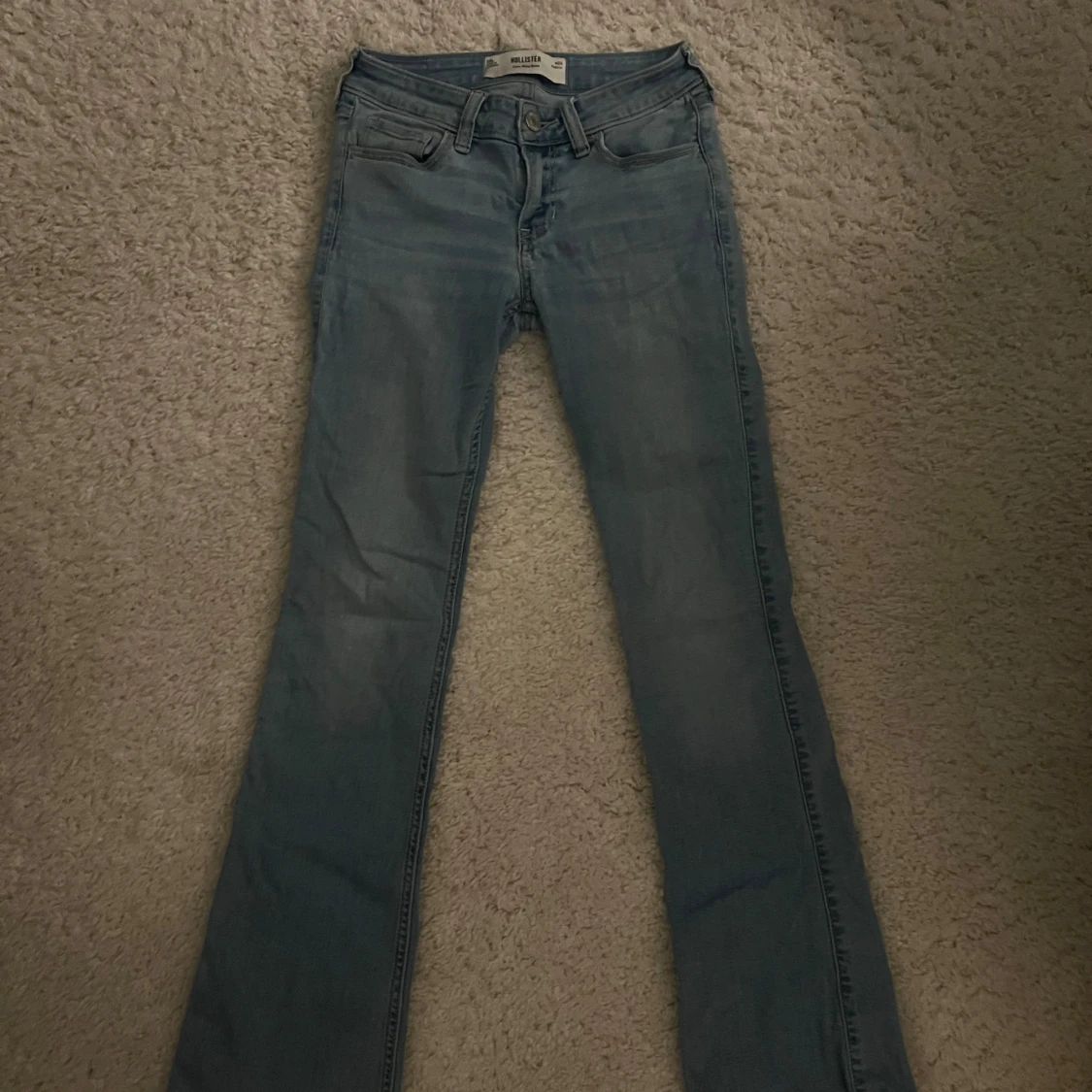 Säljer ett par ljusblå bootcut jeans från Hollister med låg midja. Klassisk femficksmodell med snygga broderade detaljer på bakfickorna.
