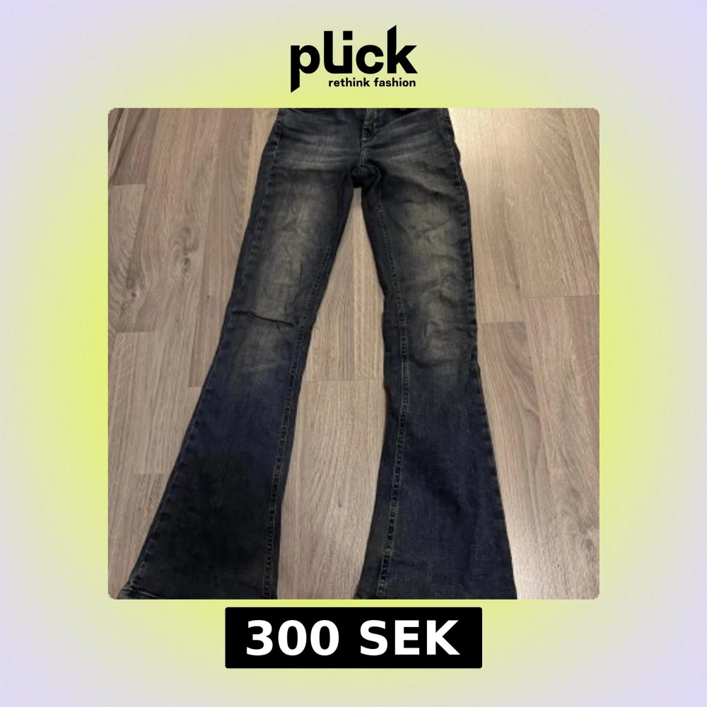 Mörkblå bootcut jeans från ONLY i storlek XS/28. Små skärda detaljer och lite ljusare på låren. Midwaist!!! Pris kan alltid diskuteras och skriv om frågor💕💕