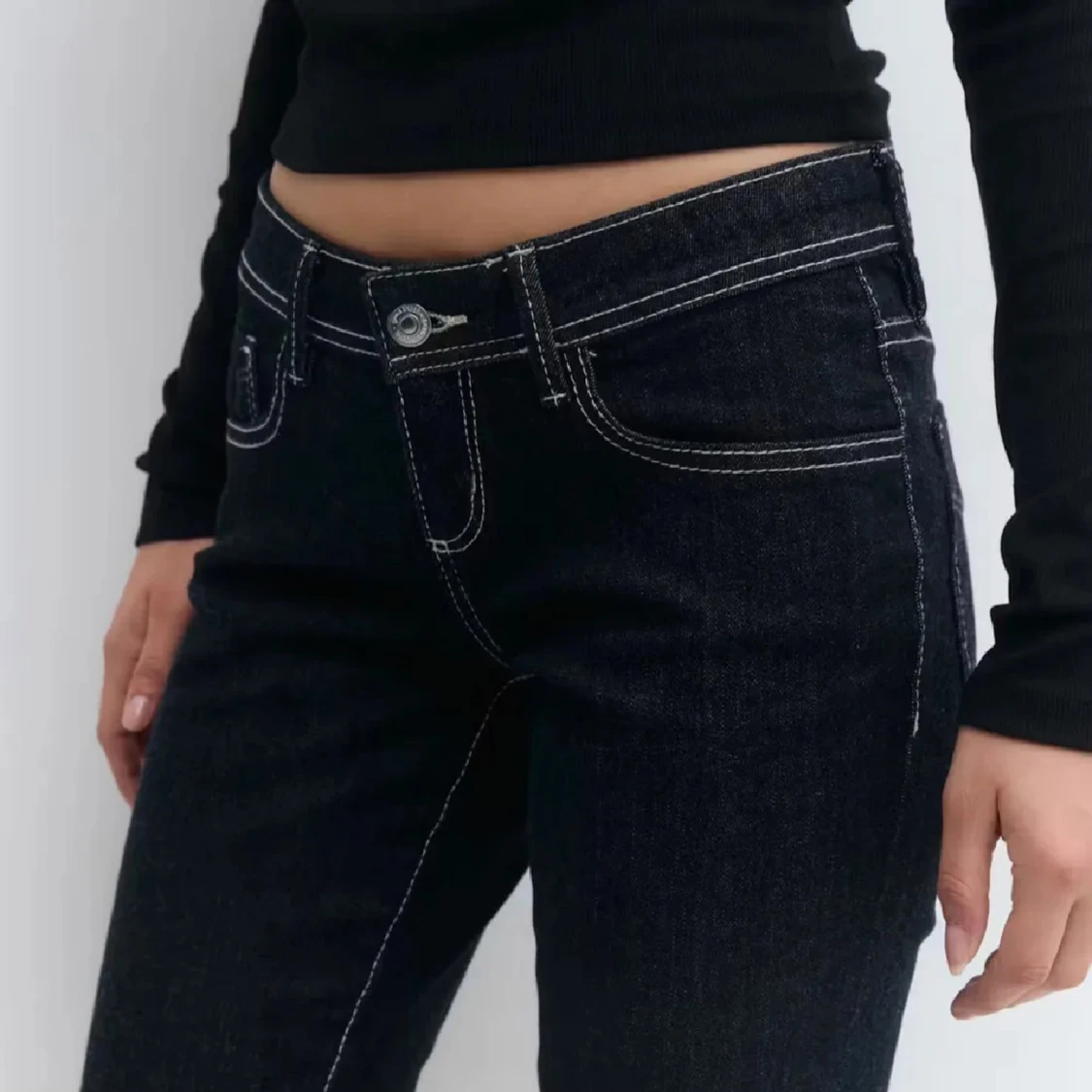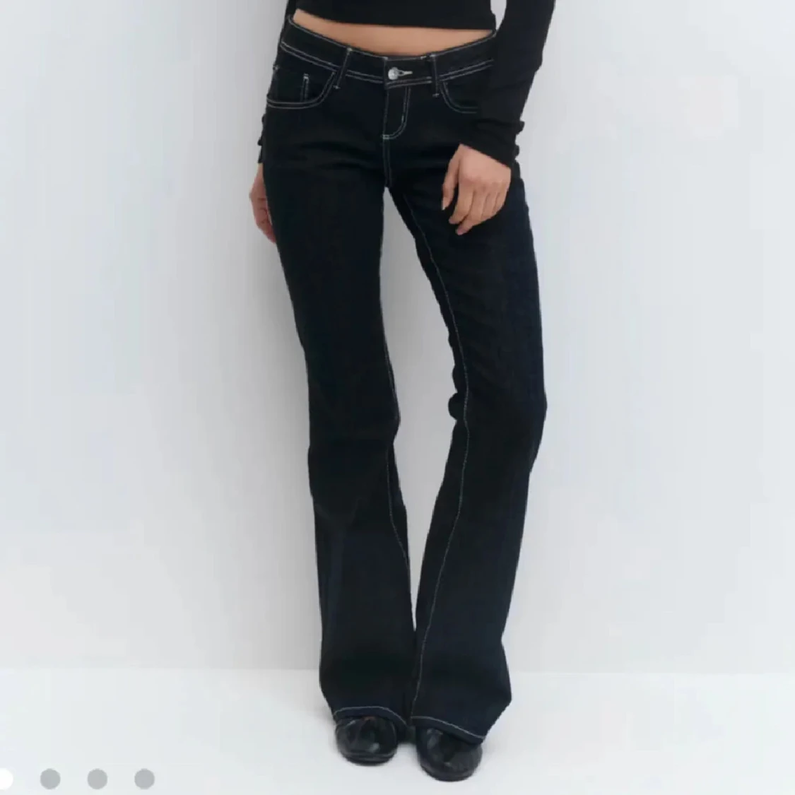 Snygga mörkblåa bootcut jeans från Perfect Jeans med låg midja och kontrasterande vita sömmar. Jeansen har klassisk femficksdesign och är tillverkade i jeansmaterial. Perfekta för dig som gillar en retroinspirerad look med markerad siluett.