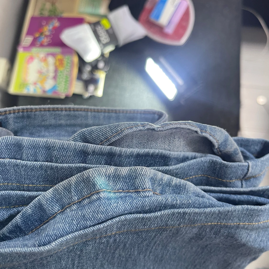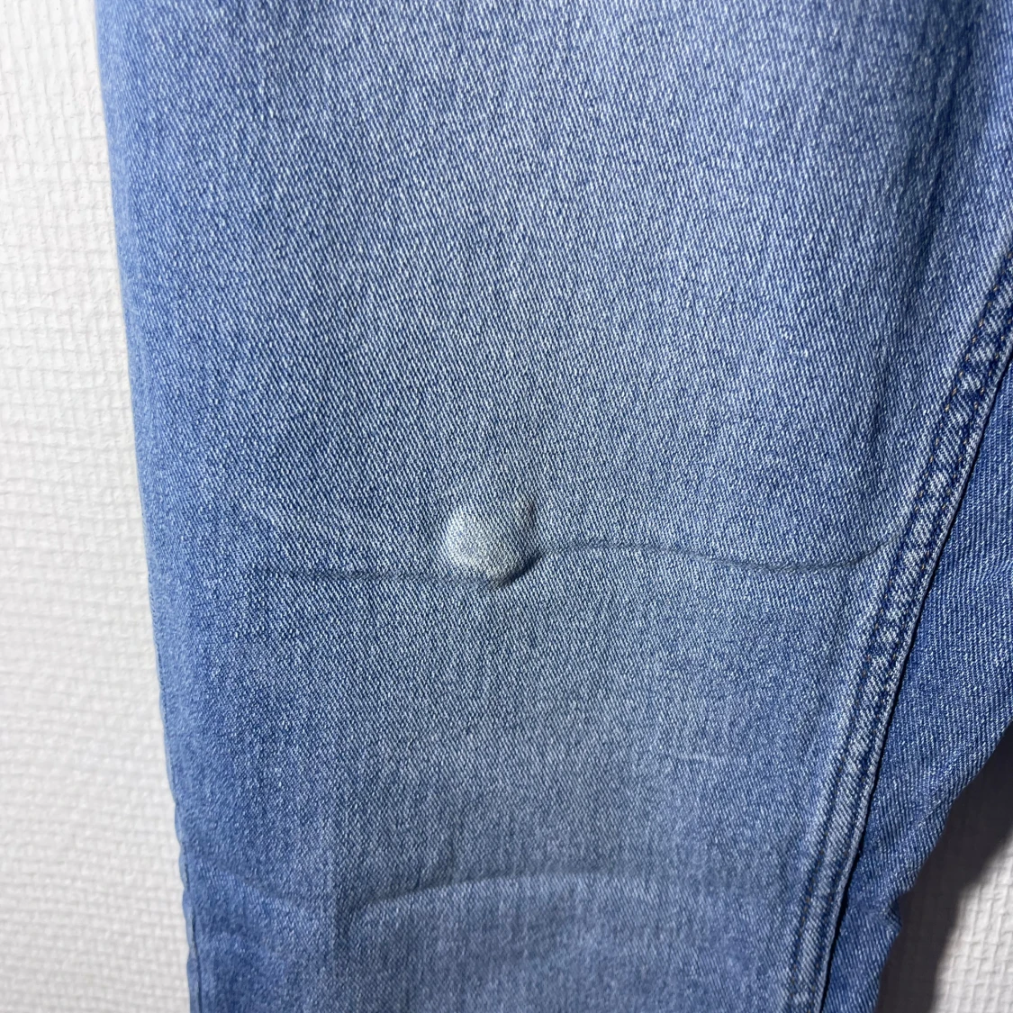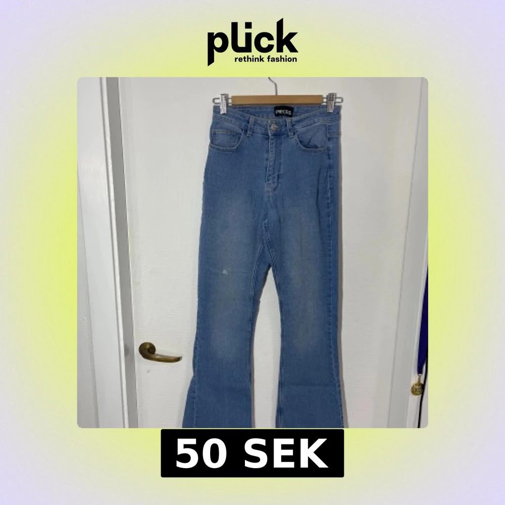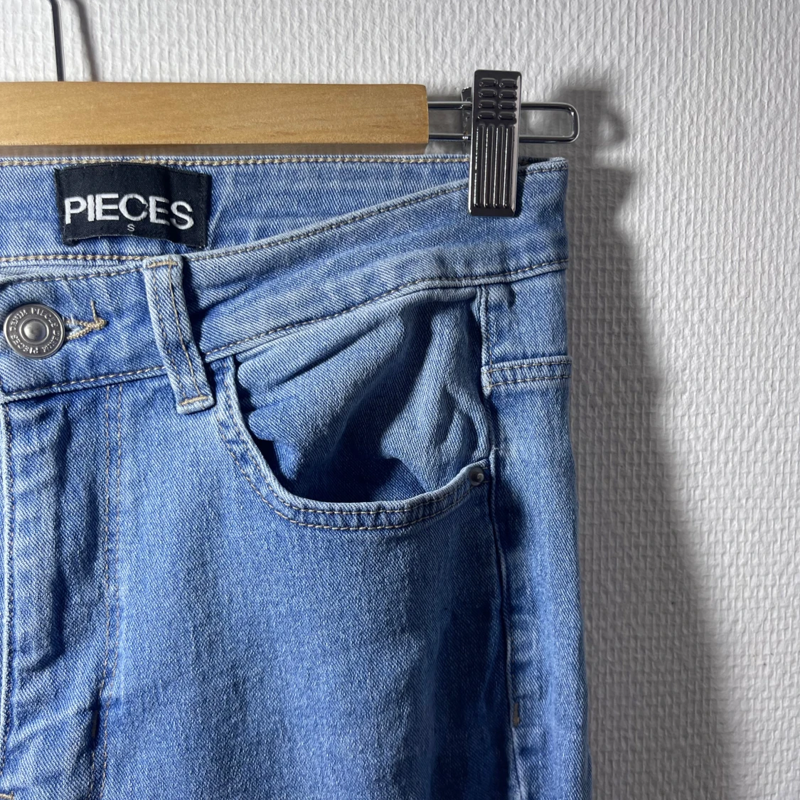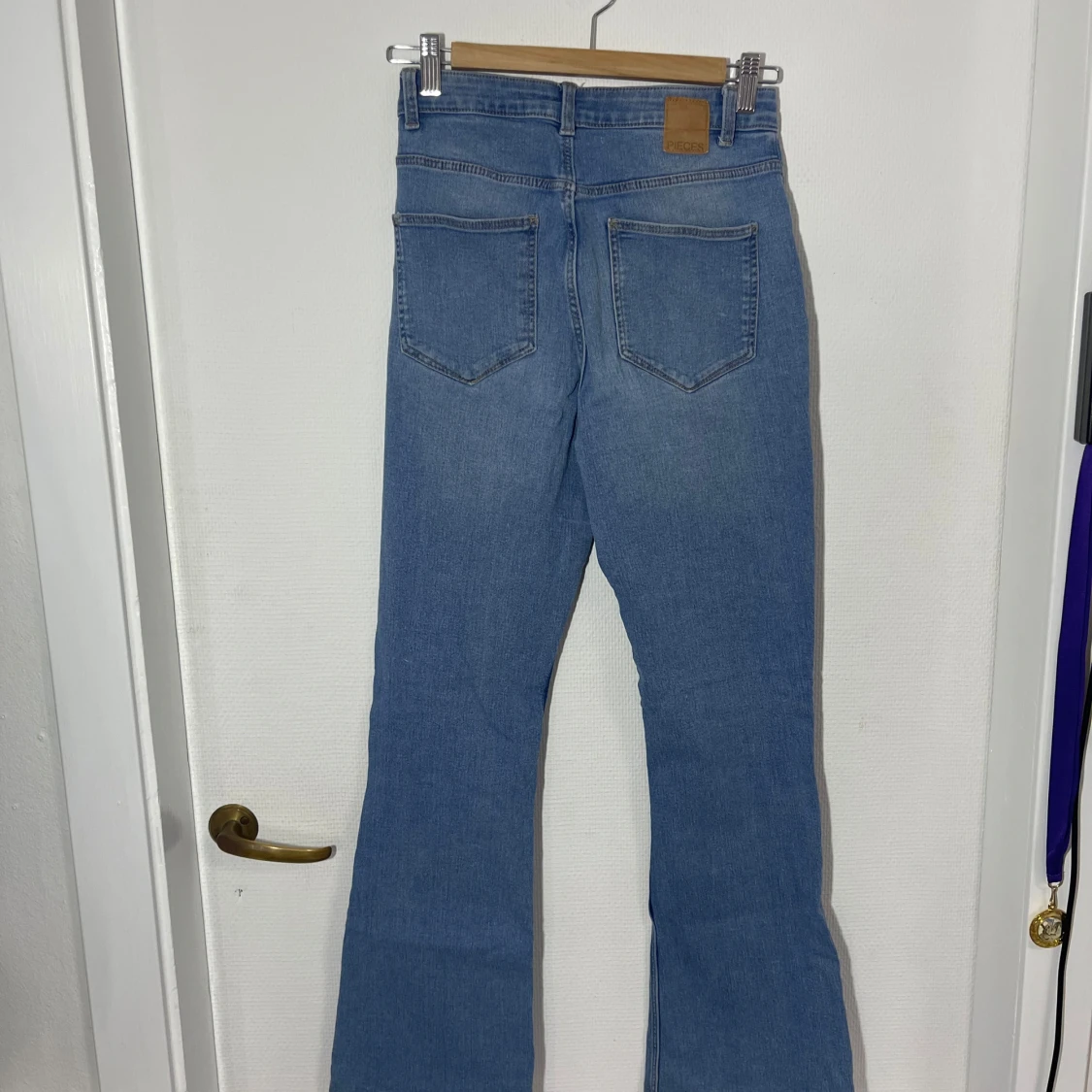 Snygga blå jeans från Pieces med klassisk femficksdesign och knappgylf. De har en utsvängd passform och är perfekta för en avslappnad stil. Jeansen har en ljusblå tvätt som ger en fräsch look. Uppsydda nedtill. Liten vit fläck framtill.