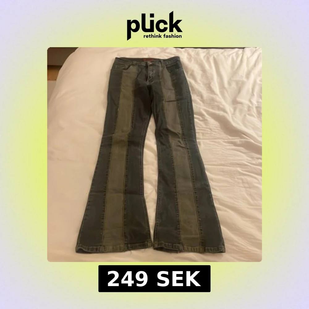 Unika bootcut jeans från R.Marks med cool patchwork-design i olika nyanser av ljusgrön och mörkblå. Jeansen har bootcut ben, synliga sömmar och råa kanter vid bensluten. Tillverkade i denim med klassisk femficksmodell och knappgylf. De är mid waist.
