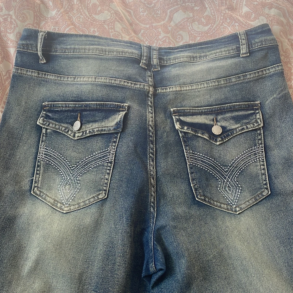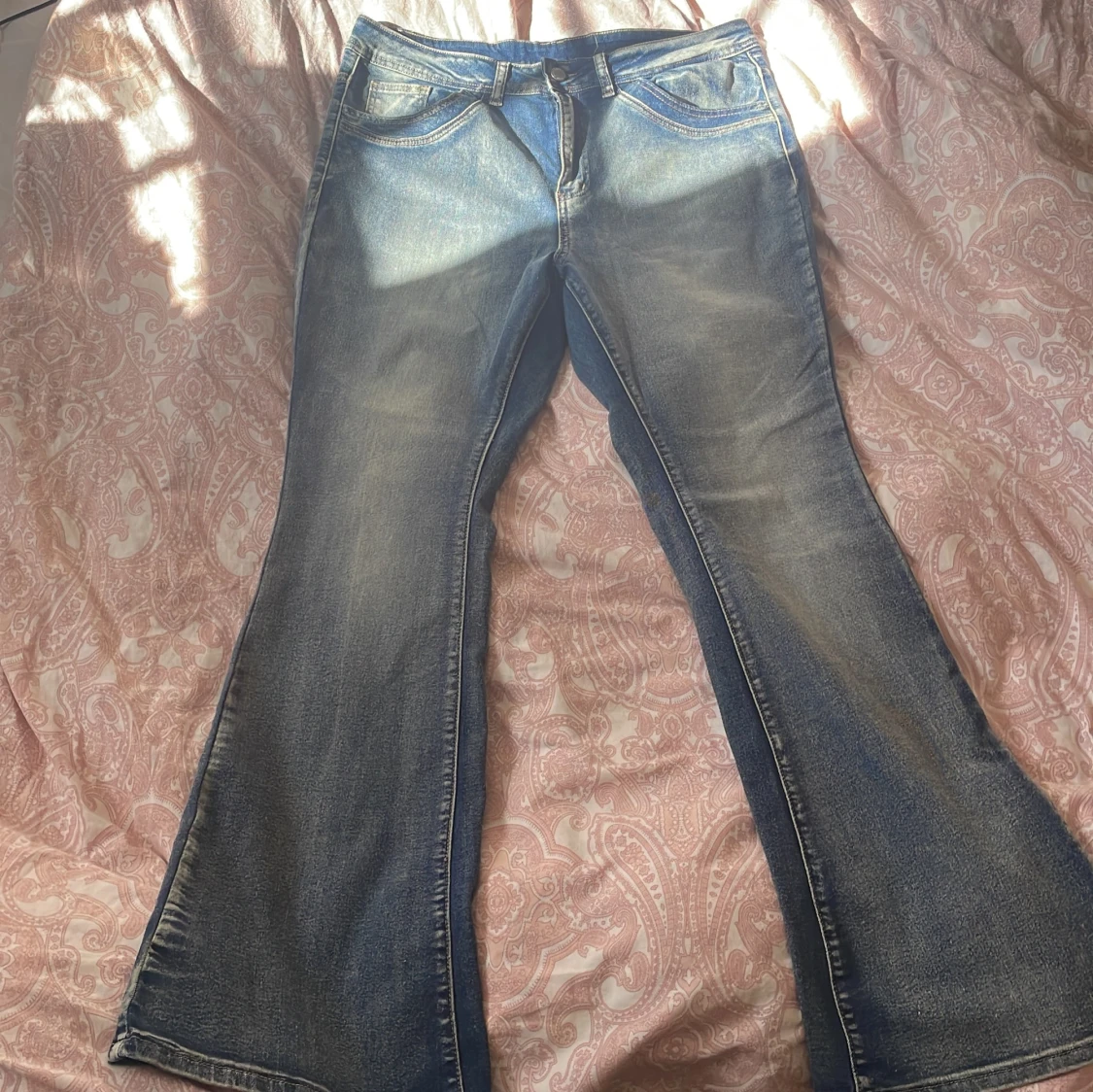 Snygga blå bootcut jeans från SHEIN Curve i storlek 1XL. Jeansen har klassisk femficksdesign, coola bakfickor med broderade detaljer och knappar. Materialmix med bomull, polyester, lyocell, viskos och elastan för skön stretch och passform.