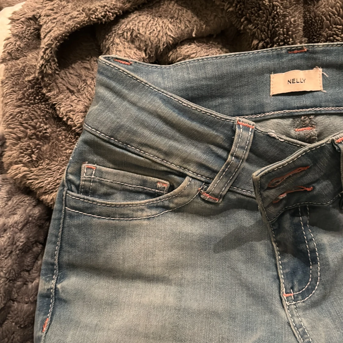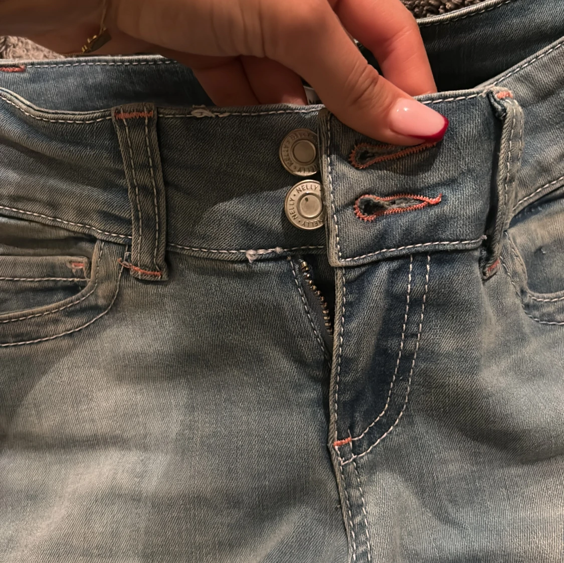 Bootcut jeans från Nelly i ljusblå tvättad denim med klassiska fem fickor och dubbla silverfärgade knappar framtill. Snygga kontrastsömmar i orange och normal passform. Perfekta för dig som gillar retrovibbar och vill ha ett par jeans med lite extra attityd.