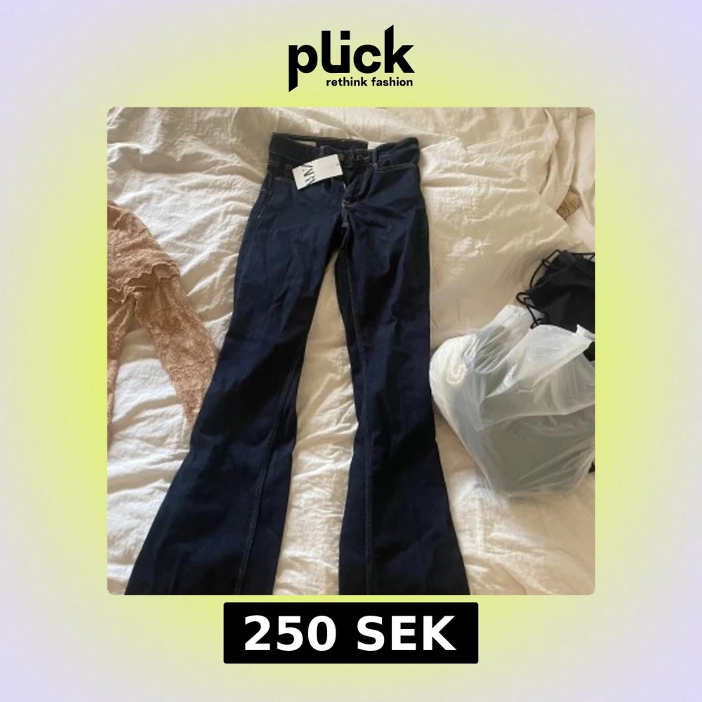 Snygga bootcut jeans från Zara i mörkblå denim. Byxorna har midwaist, klassiska fickor och kontrastsömmar. Perfekta för dig som gillar en tidlös look med lite utsvängda ben. Stängs med dragkedja och knapp.