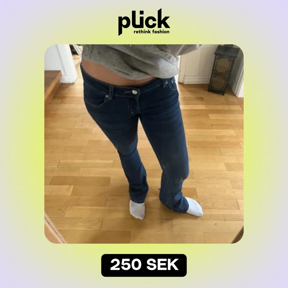 Mörkblå bootcut jeans med lågmidja. Lite slitna där nere men inget man tänker på💕