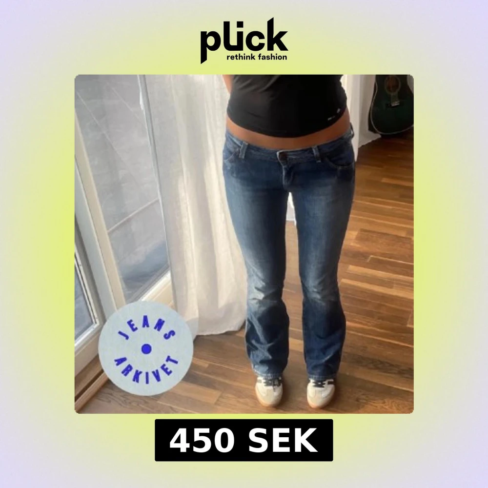 Snygga blå jeans med bootcut och låg midja🤍Klassisk femficksdesign och dragkedja med knappstängning. Köptes här på plick från Jeans Arkivet. De första två bilderna är lånade och den tredje är tagen av mig! Köptes för 650kr