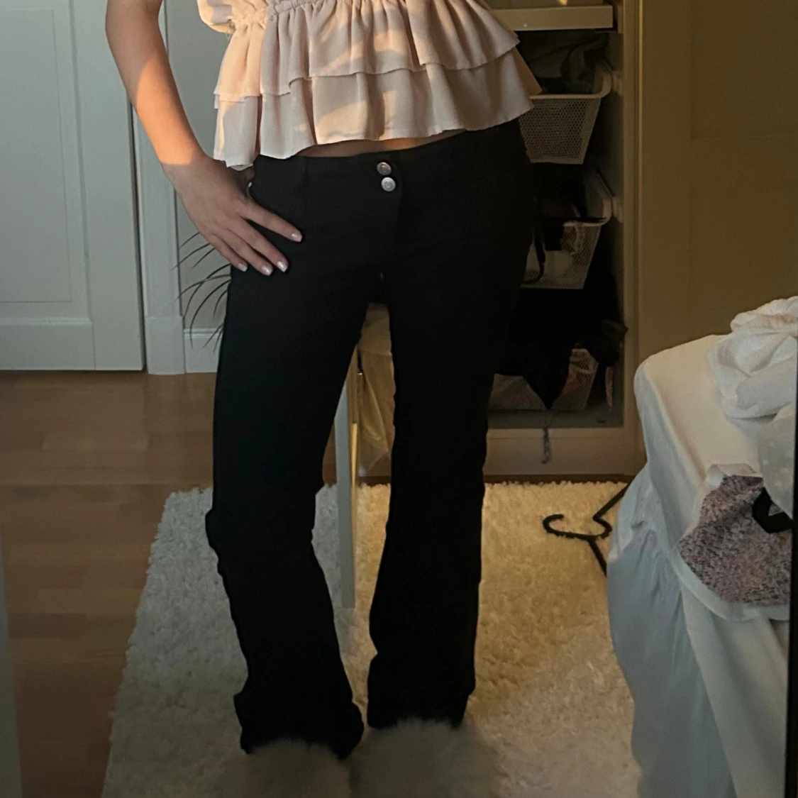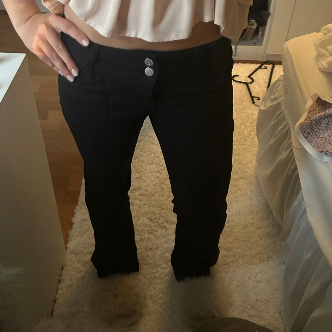 Snygga svarta jeans med bootcut-snitt och två silverfärgade knappar i midjan. Låg midja och klassisk femficksdesign. Perfekta till sneakers eller boots för en chill och trendig look.