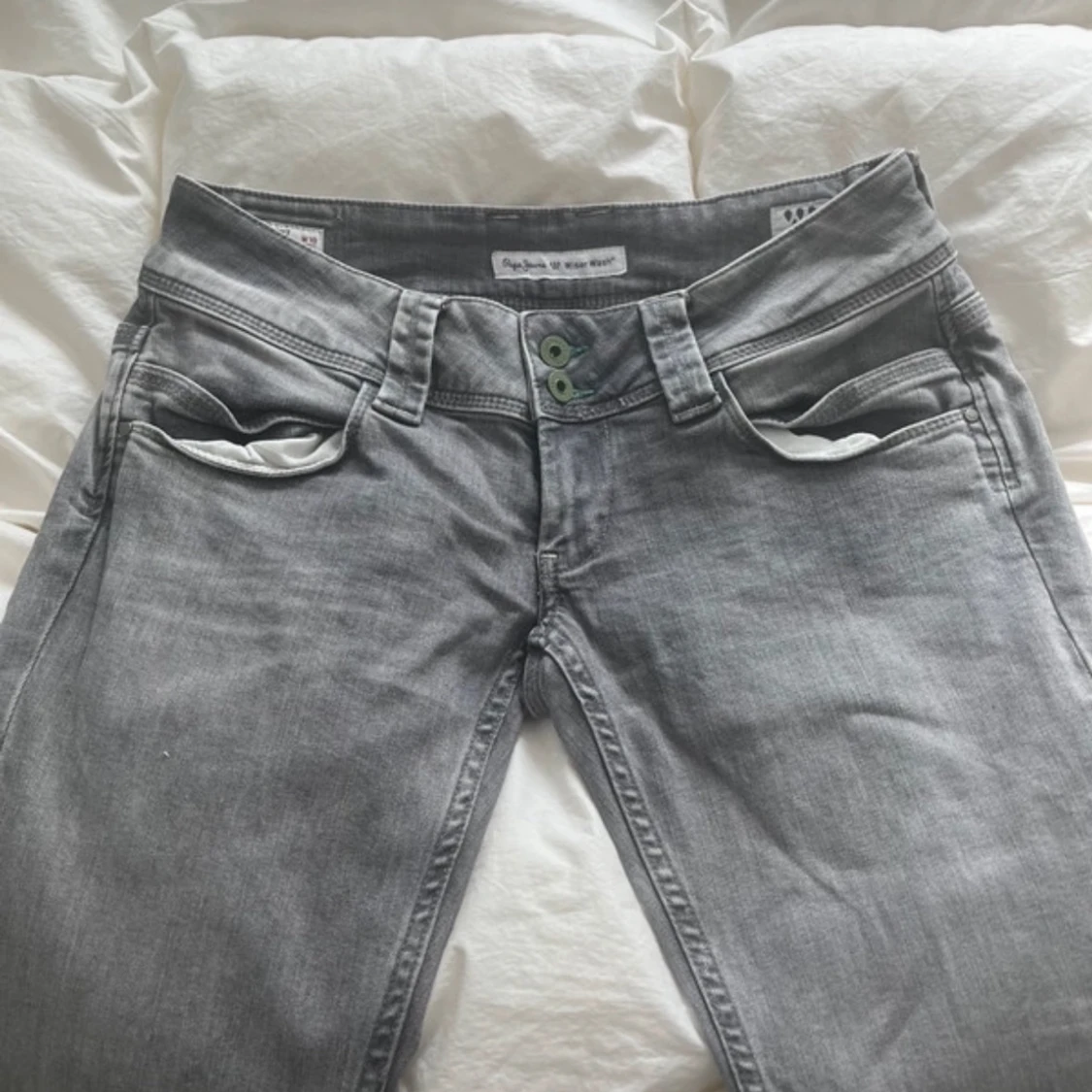Supersnygga lågmidjade pepe jeans i en fin grå färg och modellen Venus. Storlek 31x32 men väldigt små i storleken så passar w28-29 /M. De är i en straight/bootcut modell.