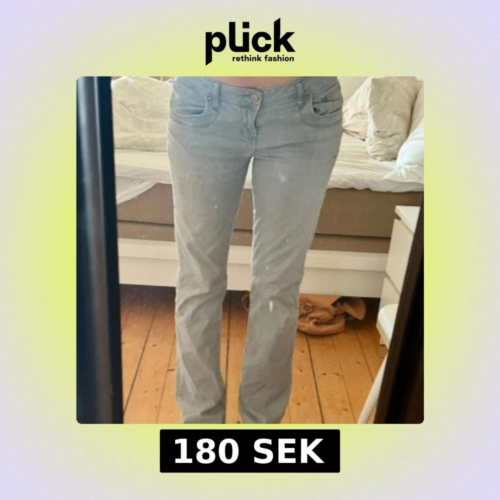Säljer ett par ljusgrå jeans med bootcut passform och klassiska femficksdetaljer. Jeansen har låg midja och är bootcut. Någon liten fläck på sidan men det går säkert att tvätta bort samt syns inte alls.