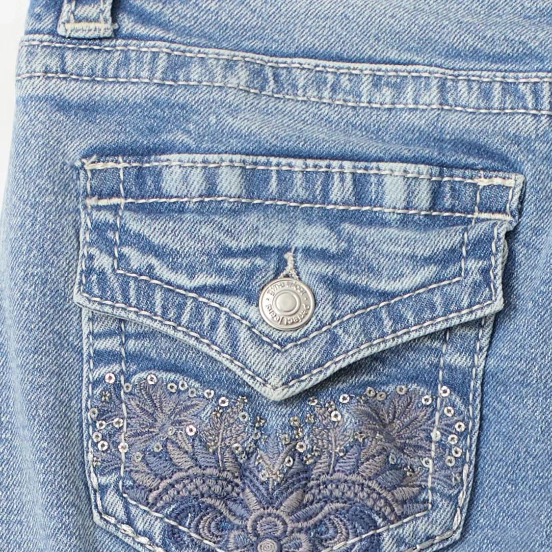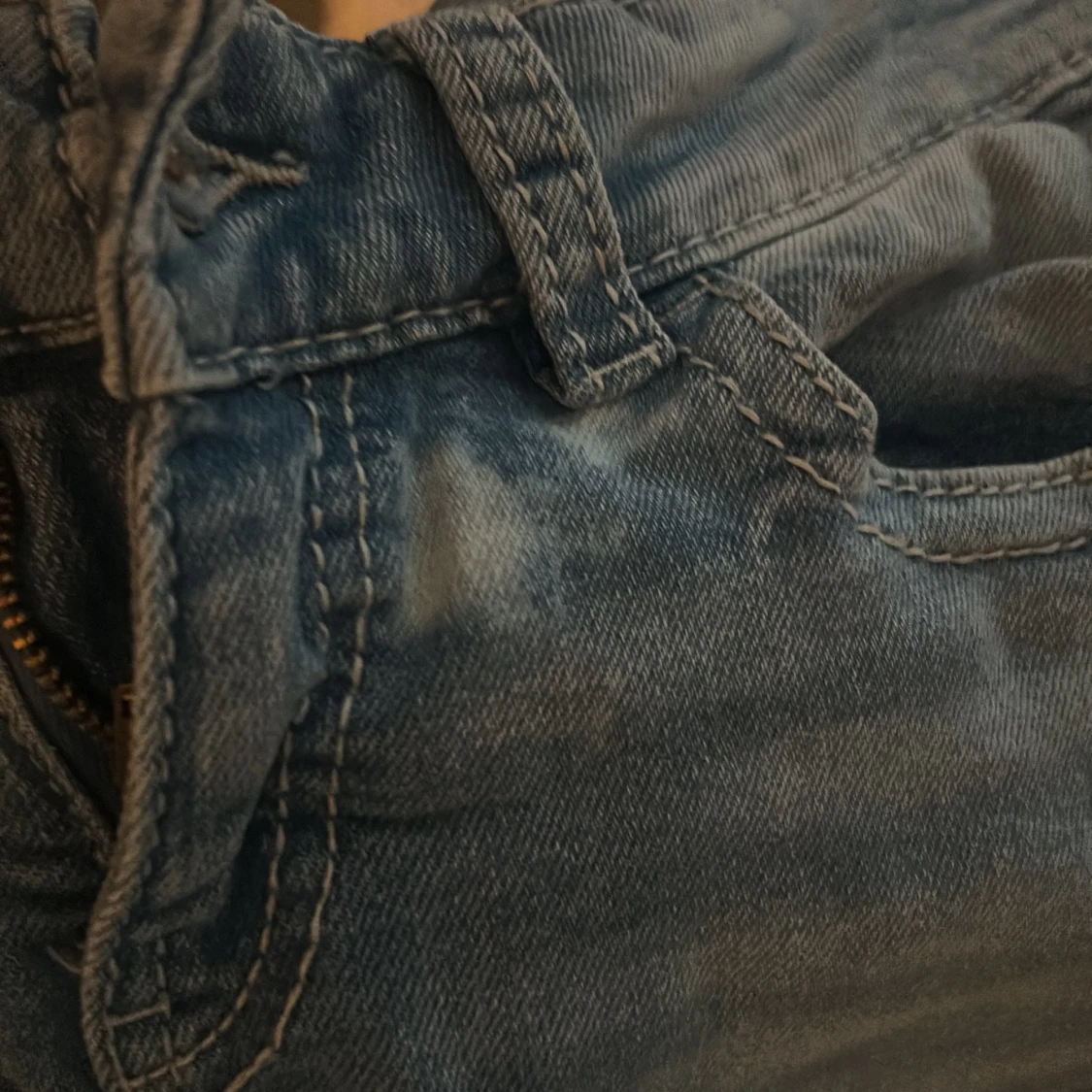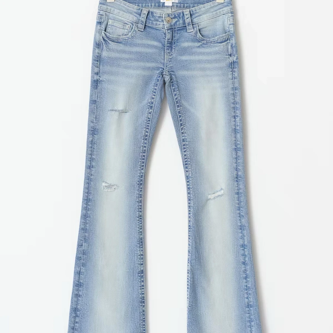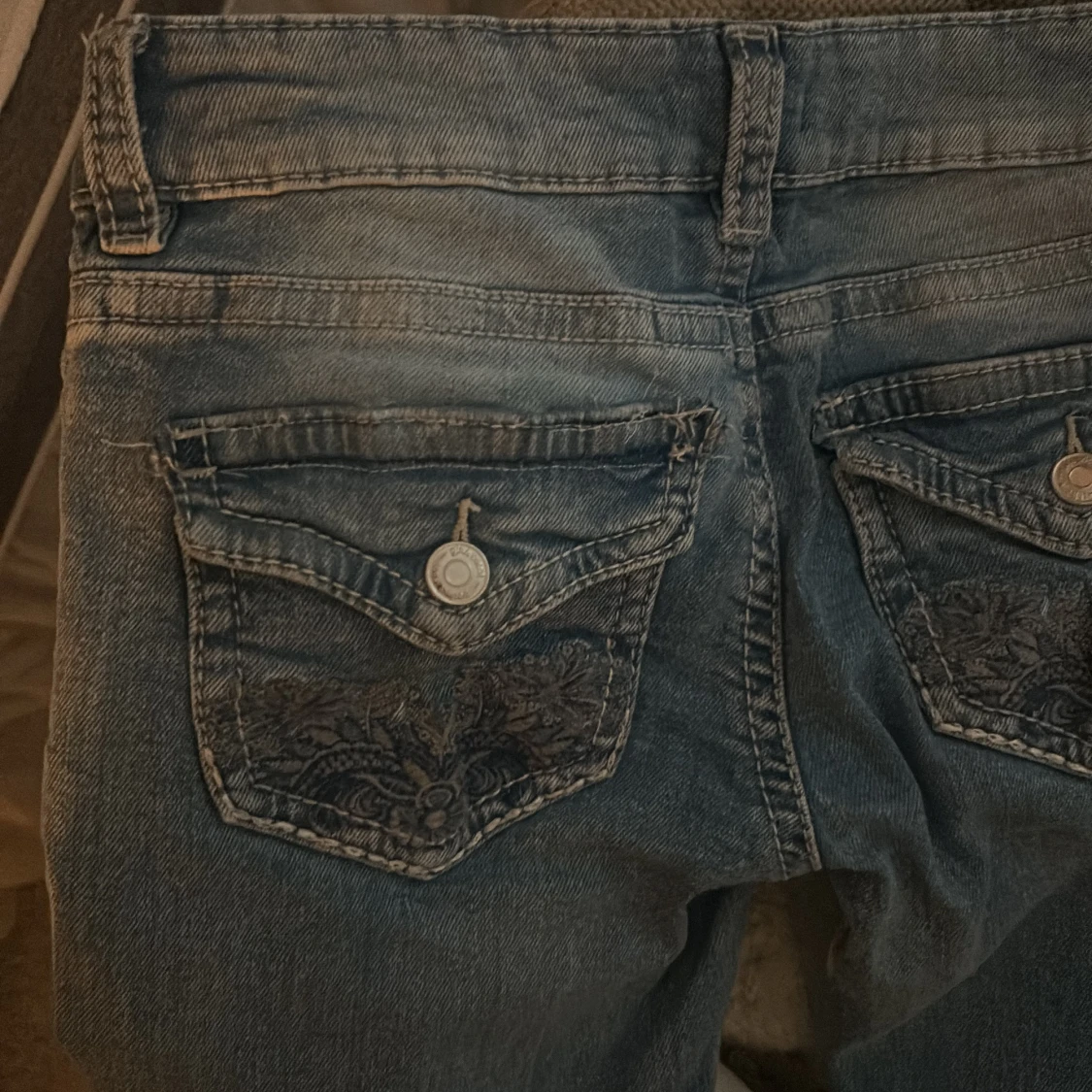 Snygga ljusblå bootcut jeans med slitningar och broderade detaljer med paljetter på bakfickan. Lågmidjade. En omsyd ficka och en bleknings fläck, se bilder! Där av pris och skick.