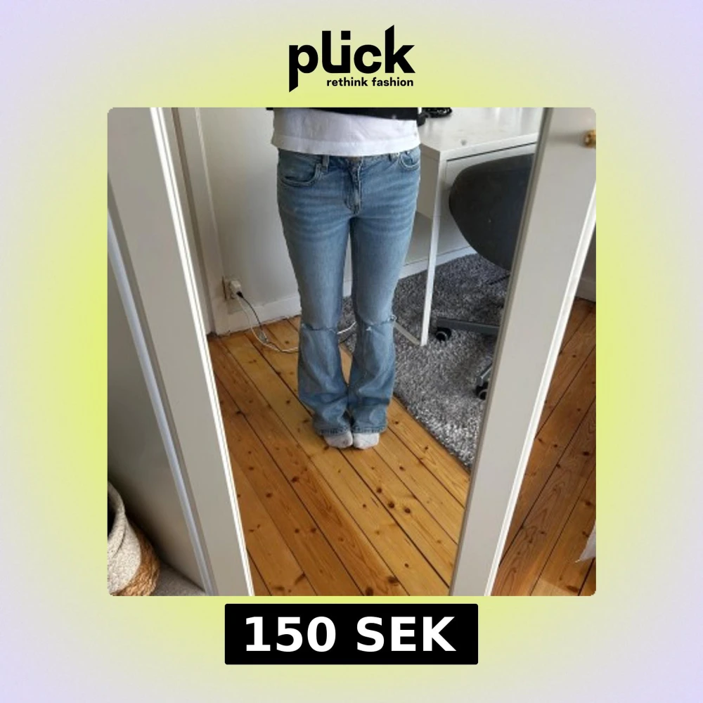 Bootcut jeans i ljusblå denim med låg midja och slitna detaljer vid knäna. Säljer då dom inte kommer till användning men dom är både sköna och snygga!!
