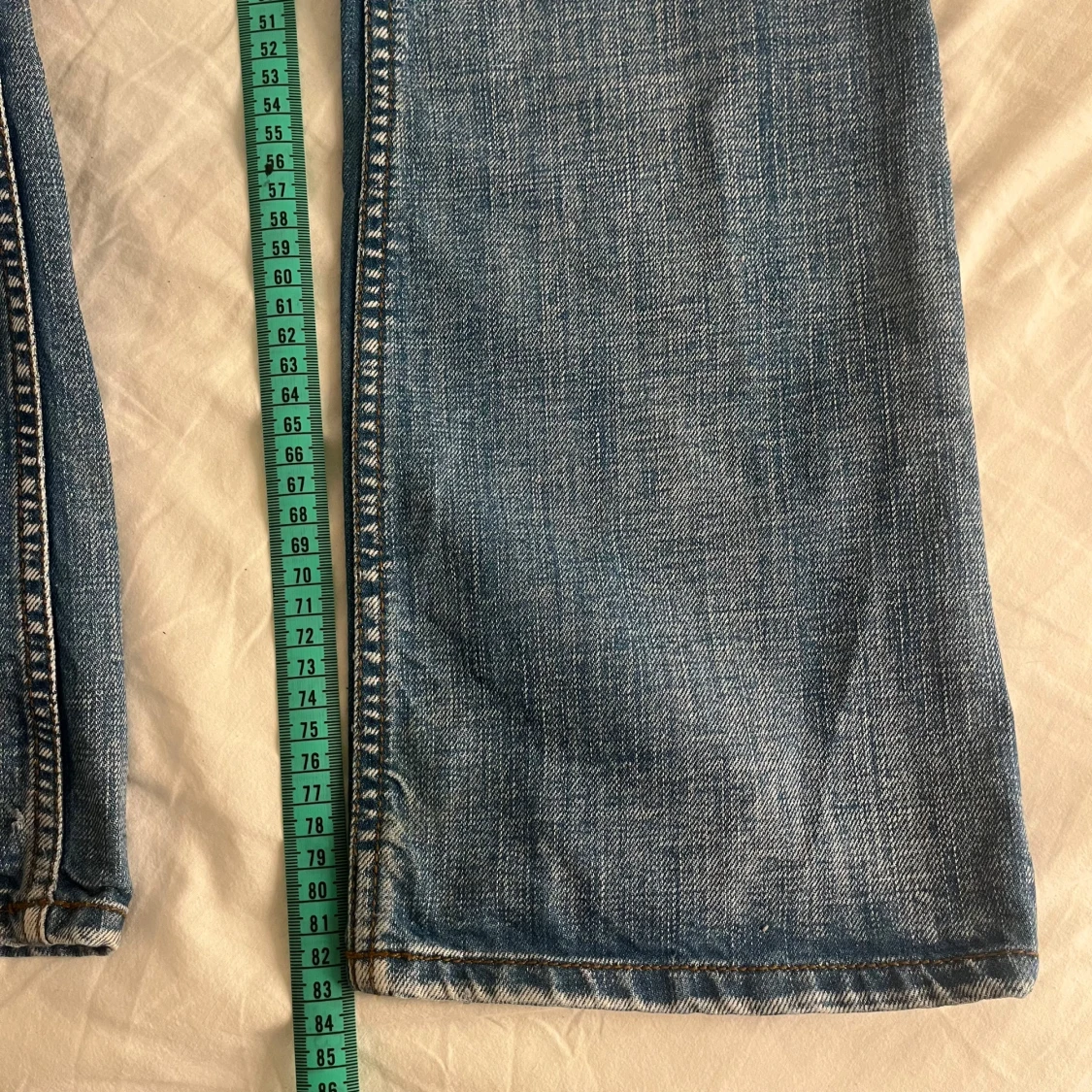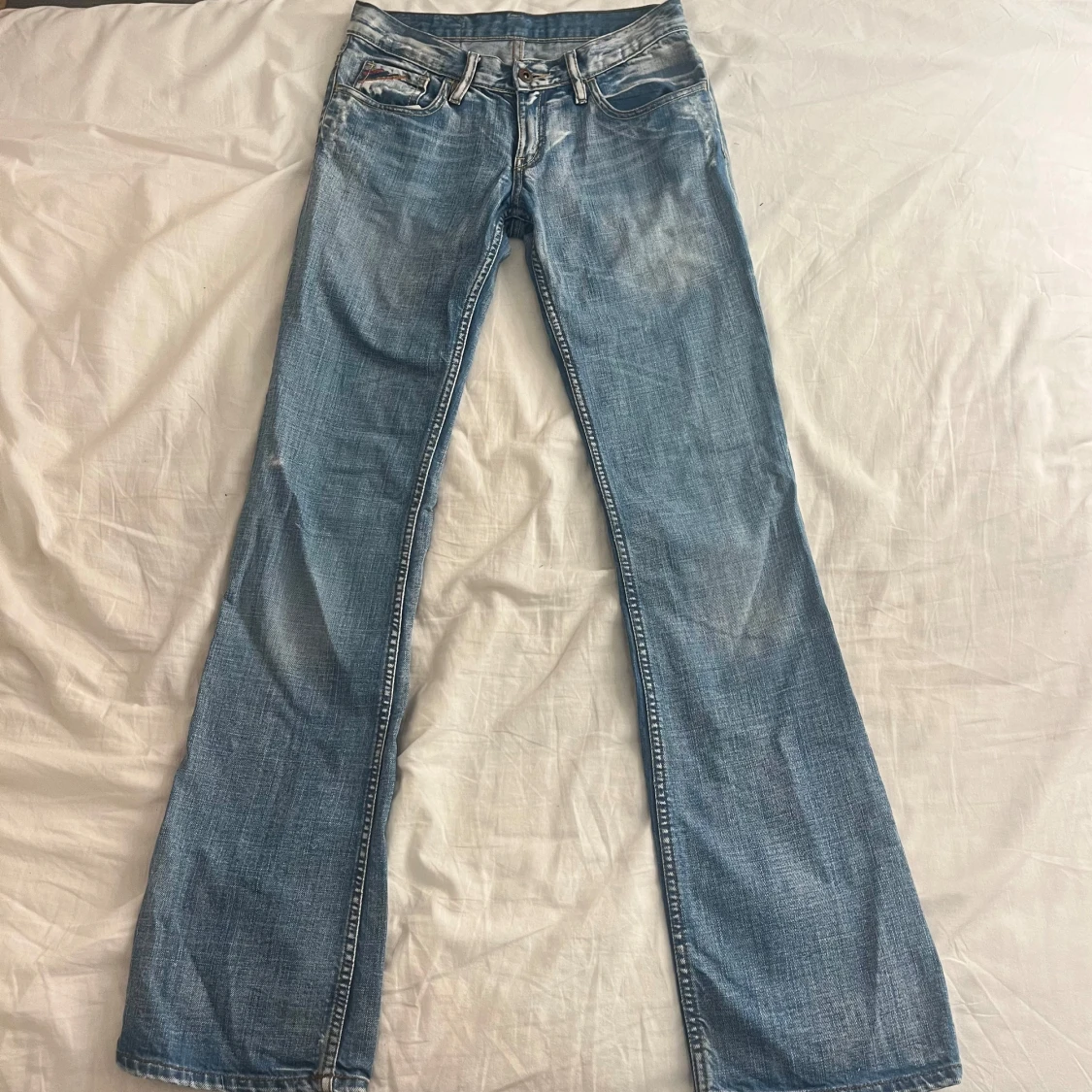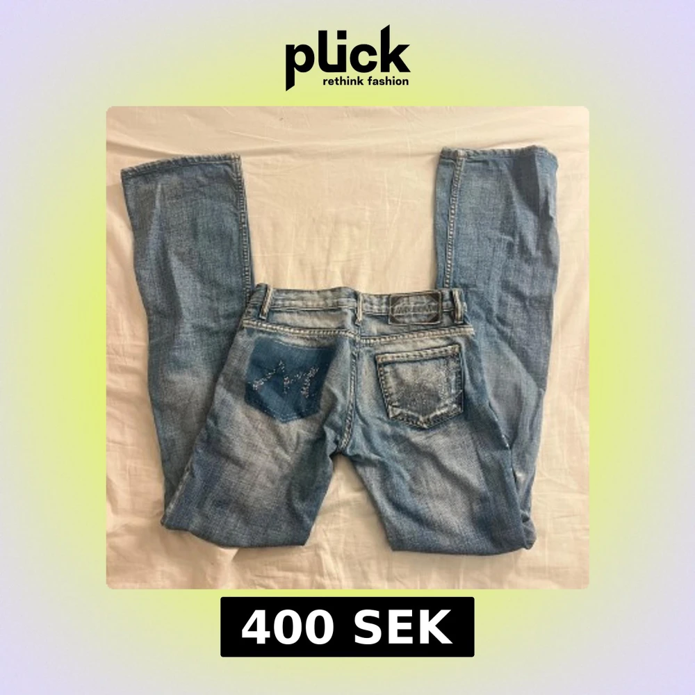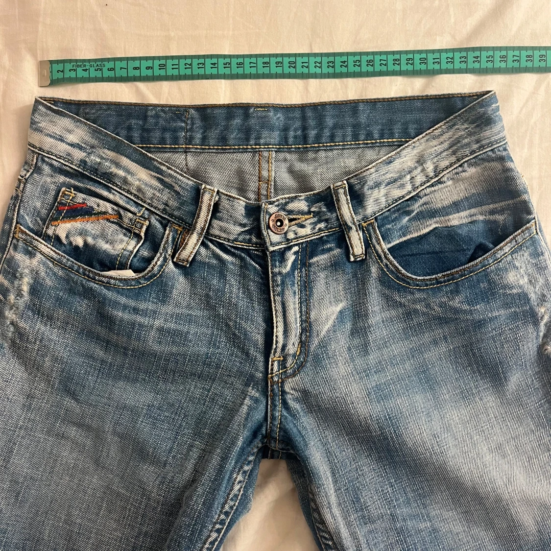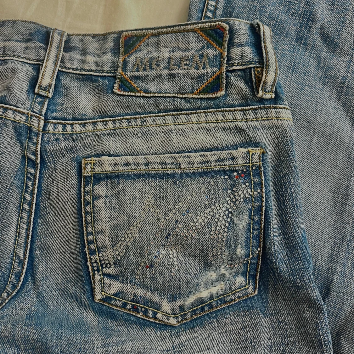 Ljusblå bootcut jeans från Mc Lem med snygga slitningar och strass/diamant detaljer på bakfickorna. Klassisk femficksmodell med låg midja och dragkedja. Jeansen har en cool tvätt och markerade sömmar. Små gröna, blå och röda detaljer. Står ingen storlek men mått finns, skulle säga ungefär xs. (Vissa stenar har lossnat)