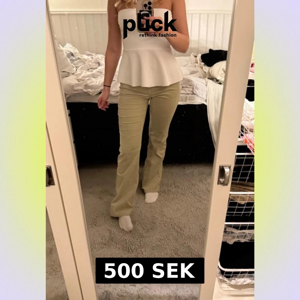 Jättefina lågmidjade beige byxor med skönt material och de efterliknar jeans. De har bra fick där bak och fram samt knapp med dragkedja där fram. De kommer ifrån capture och är i storlek 38. De passar bra på mig som vanligtvis bär storlek 36 och är 165 cm lång, de är aningen långa på mig. Annars är det väldigt bra skick!