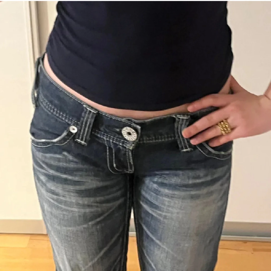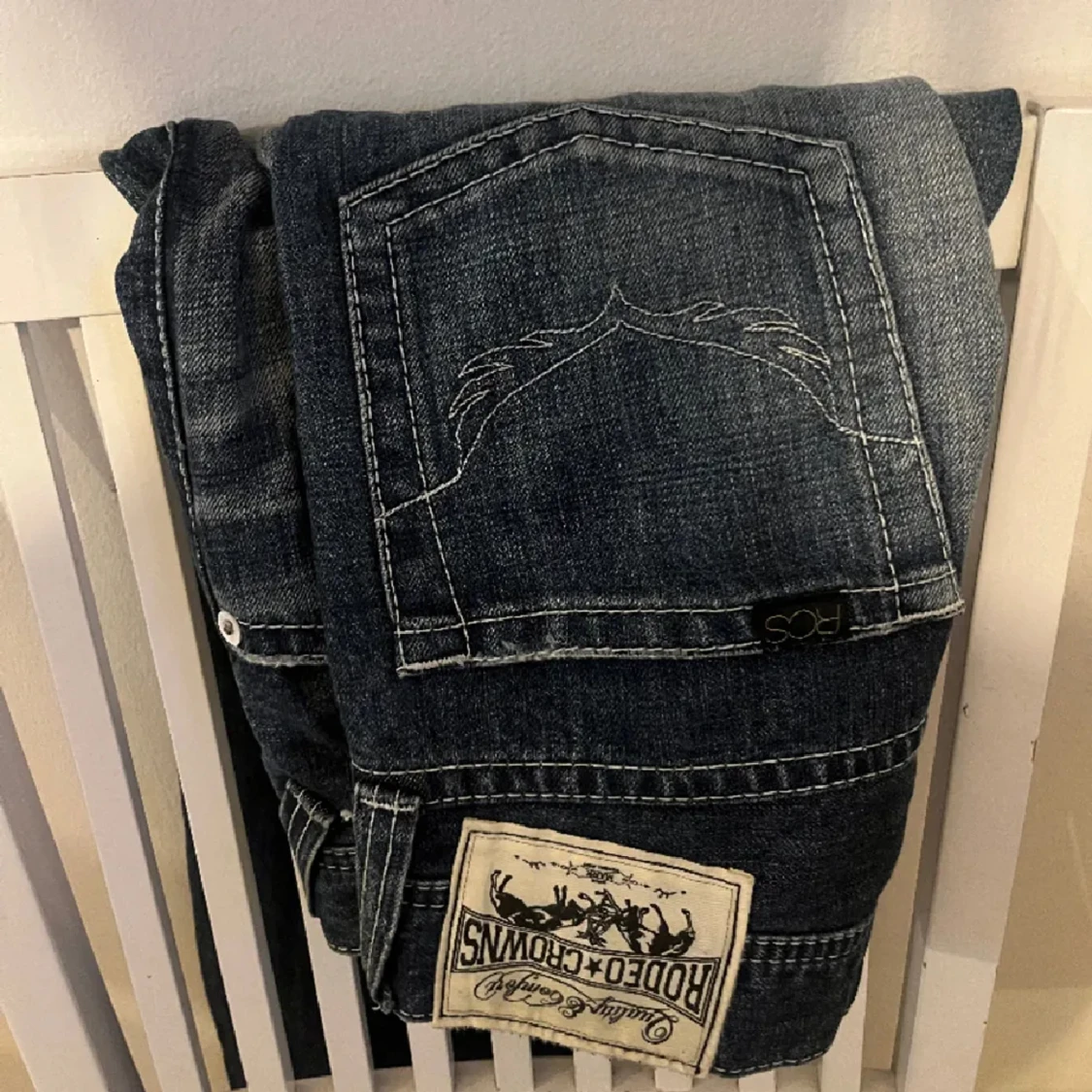 Sköna, snygga, låga jeans i utmärkt skik från Rodeo crowns med broderade detaljer på bakfickorna, kan tyvärr inte behålla då dem är lite för långa och för lite användning. Köpte dessa jeans på en vintage hemsida för 900kr. Köparen står för frakt💕💕