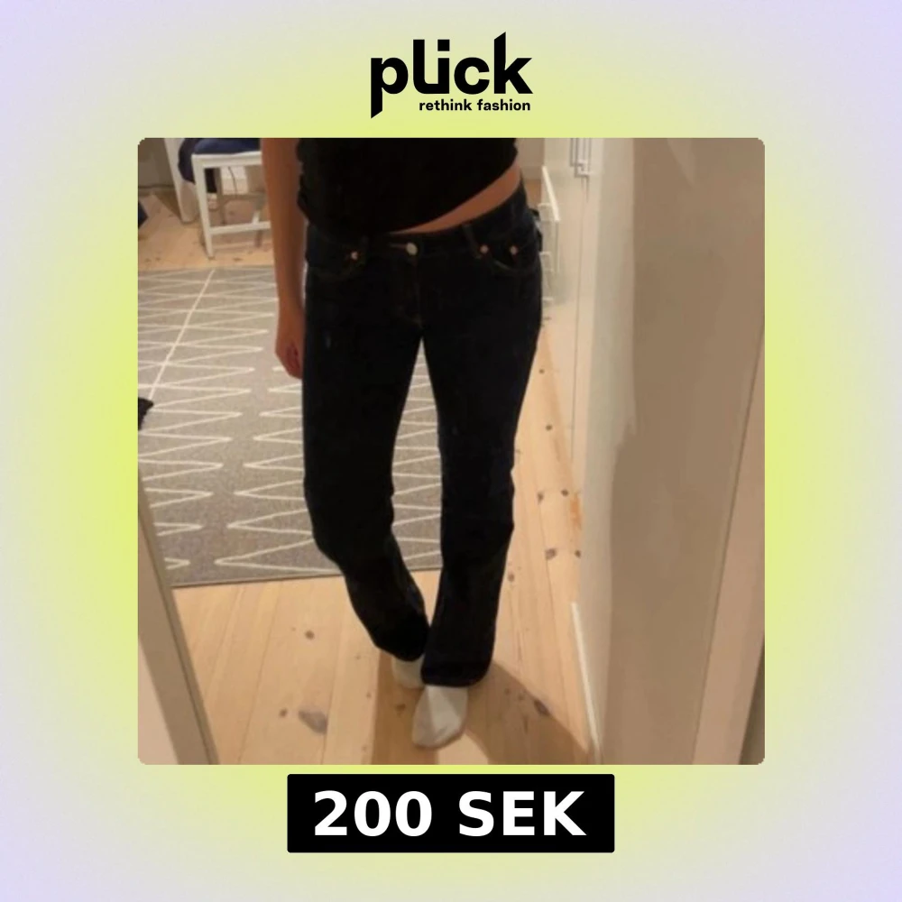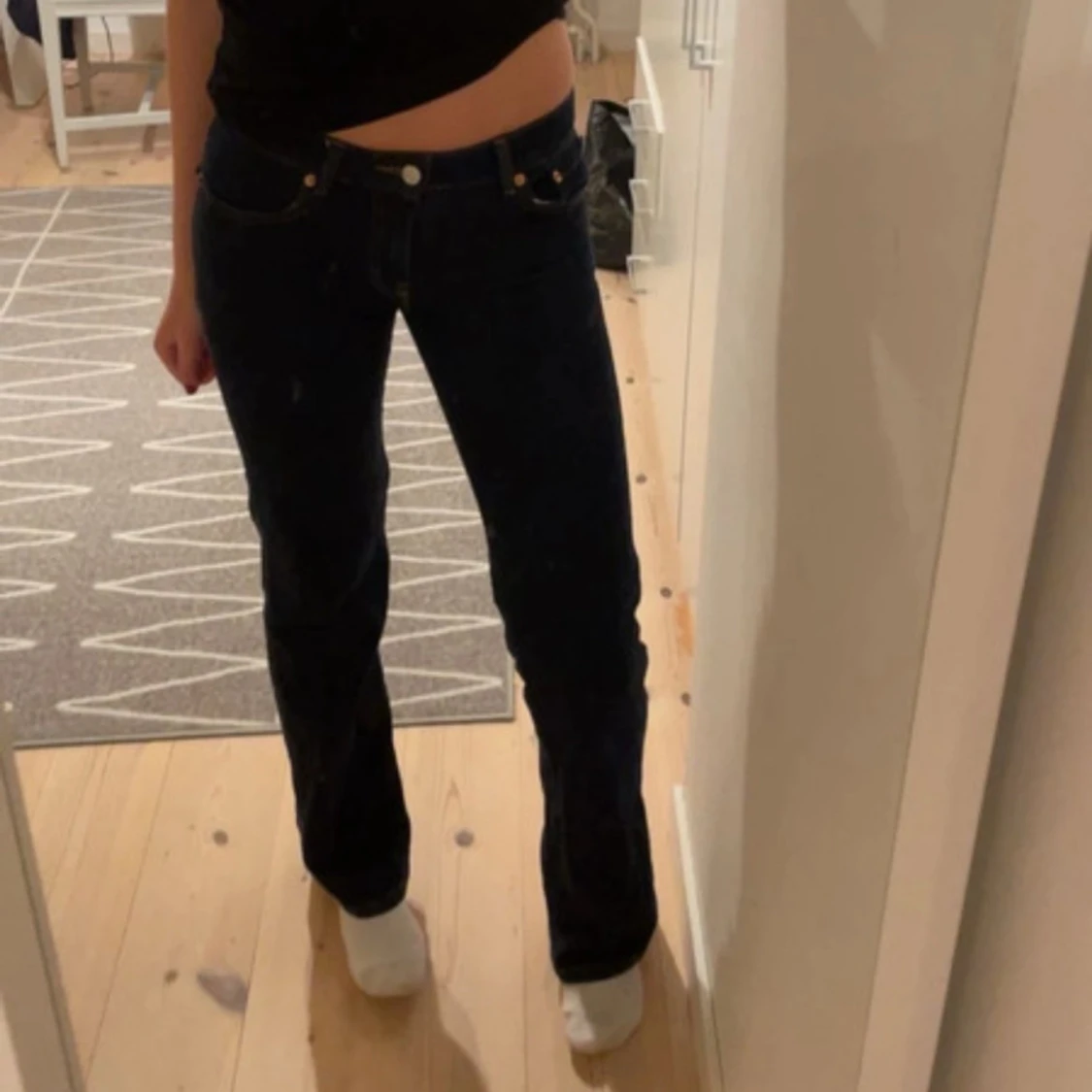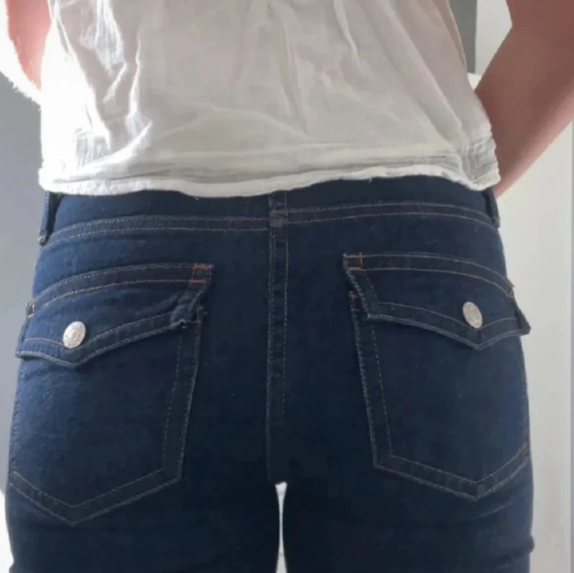 Säljer ett par mörkblå jeans med bootcut passform och låg midja. Jeansen har klassiska fickor fram och bak, där bakfickorna har snygga lock med silverfärgade knappar. Materialet är jeans och de sitter riktigt snyggt på kroppen.