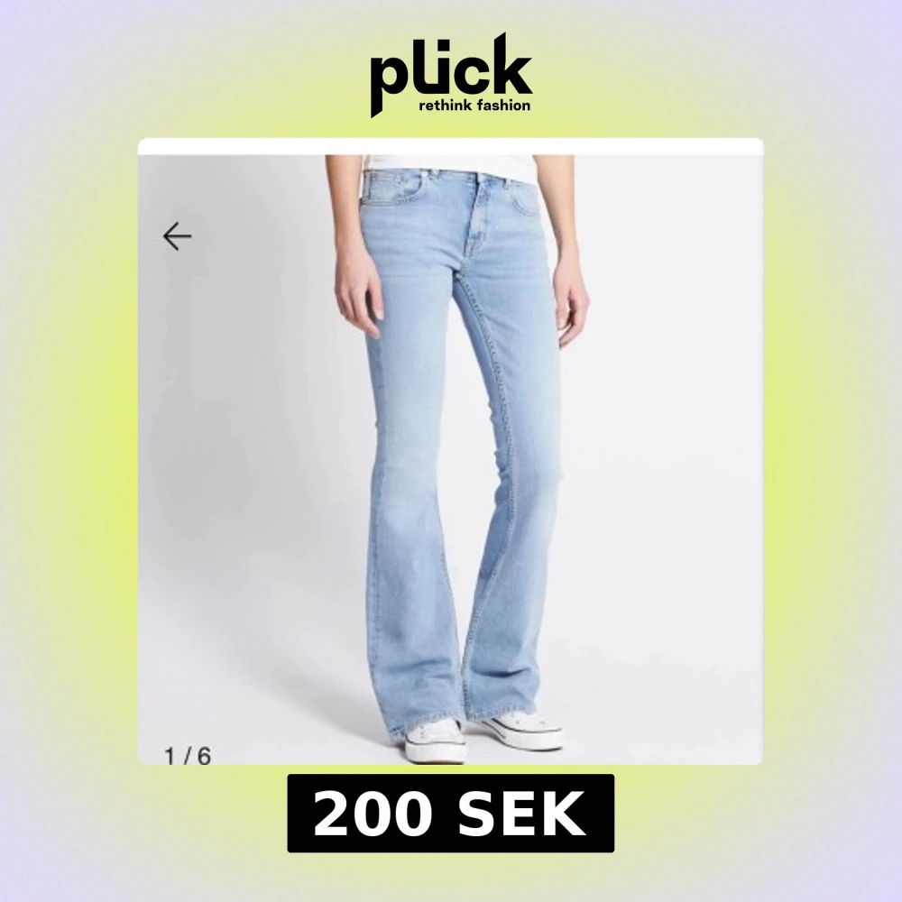 Snygga ljusblå bootcut jeans med en klassisk femficksdesign. De är low waist och är tillverkade i jeansmaterial. Passar till mycket. De är lite slitna nertill på båda benen men inget man tänker på mycket, annars i fint skick. Skulle säga att dom är lite större i storlek.