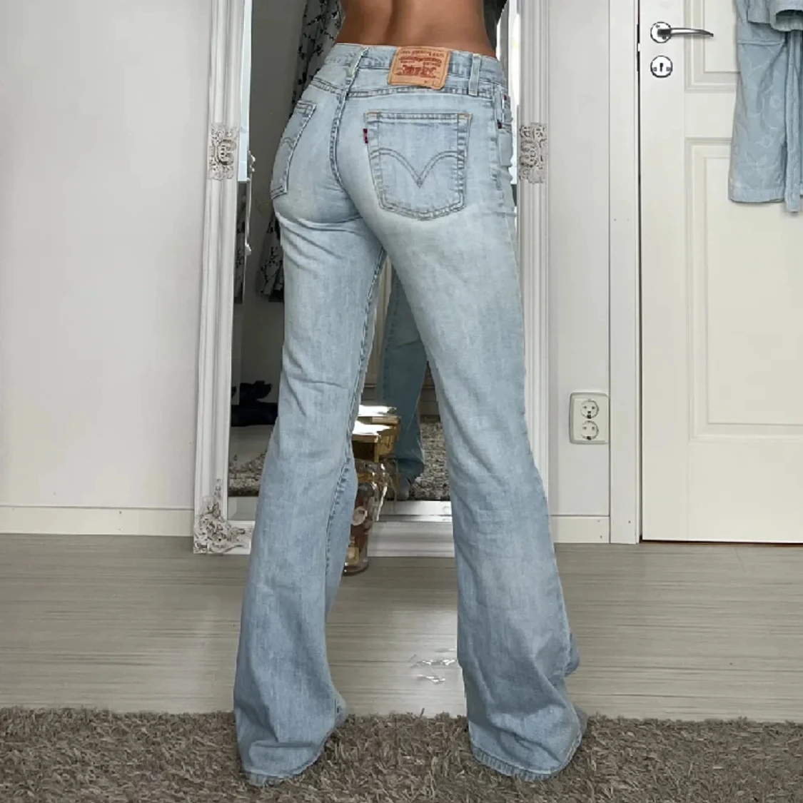 Så snygga ljusblå vintage lowwaist bootcut jeans från Levis, säljer då de tyvärr blivit för små för mig, innerbenslängd 81cm, passar mig i längd är ca 168cm , storlek 28x32, kan inte posta eller skicka fler bilder förens 8 januari är utomlands