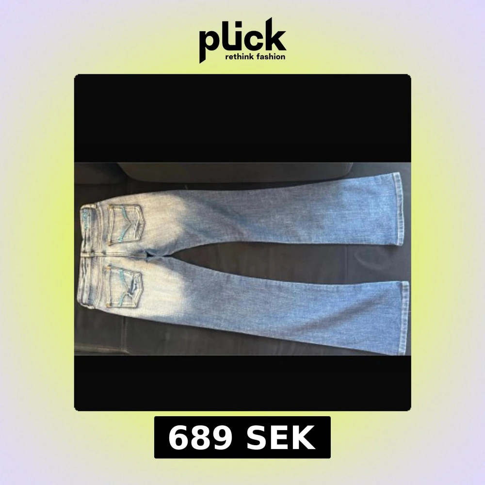 Säljer ett par blå bootcut lågmidjade jeans med snygga slitningar och turkosa detaljer på bakfickorna. Jätte fint skick